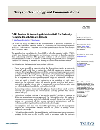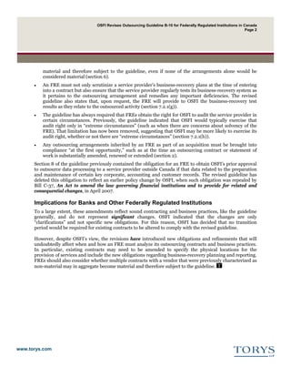 On March 11, 2009, OSFI released a revised guideline B-10 addressing outsourcing for federally regulated institutions in Canada, introducing significant changes such as a lower threshold for material contracts and enhanced business recovery obligations. The revisions aim to clarify existing practices rather than impose new obligations, although institutions may need to amend current contracts to comply with new requirements. Key points include the need for detailed service location information, ongoing assessments of service providers, and OSFI's expanded audit rights over outsourced services.