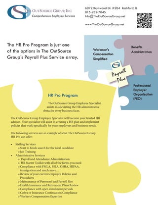 The Outsource Group, Inc. offers comprehensive HR services through its HR Pro Program, designed to alleviate administrative challenges for businesses. Services include staffing, payroll and attendance administration, compliance support, and policy development tailored to specific business needs. Their employee specialists act as trusted advisors to help implement effective HR strategies.