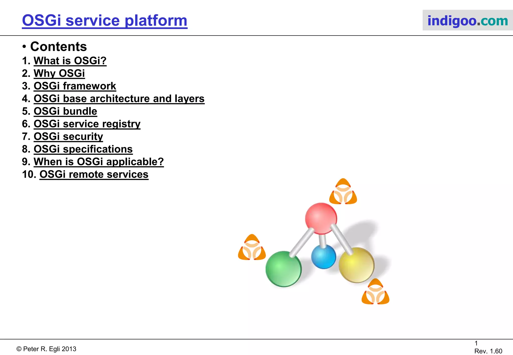 The document provides a comprehensive overview of the OSGi (Open Services Gateway initiative) framework, a component-based technology that facilitates modular systems in Java. It covers the architecture, components, lifecycle, service registry, and security aspects of OSGi, highlighting its benefits over Java's traditional modularity. Additionally, it outlines various specifications related to OSGi, aiming to enhance the management of modular software applications.