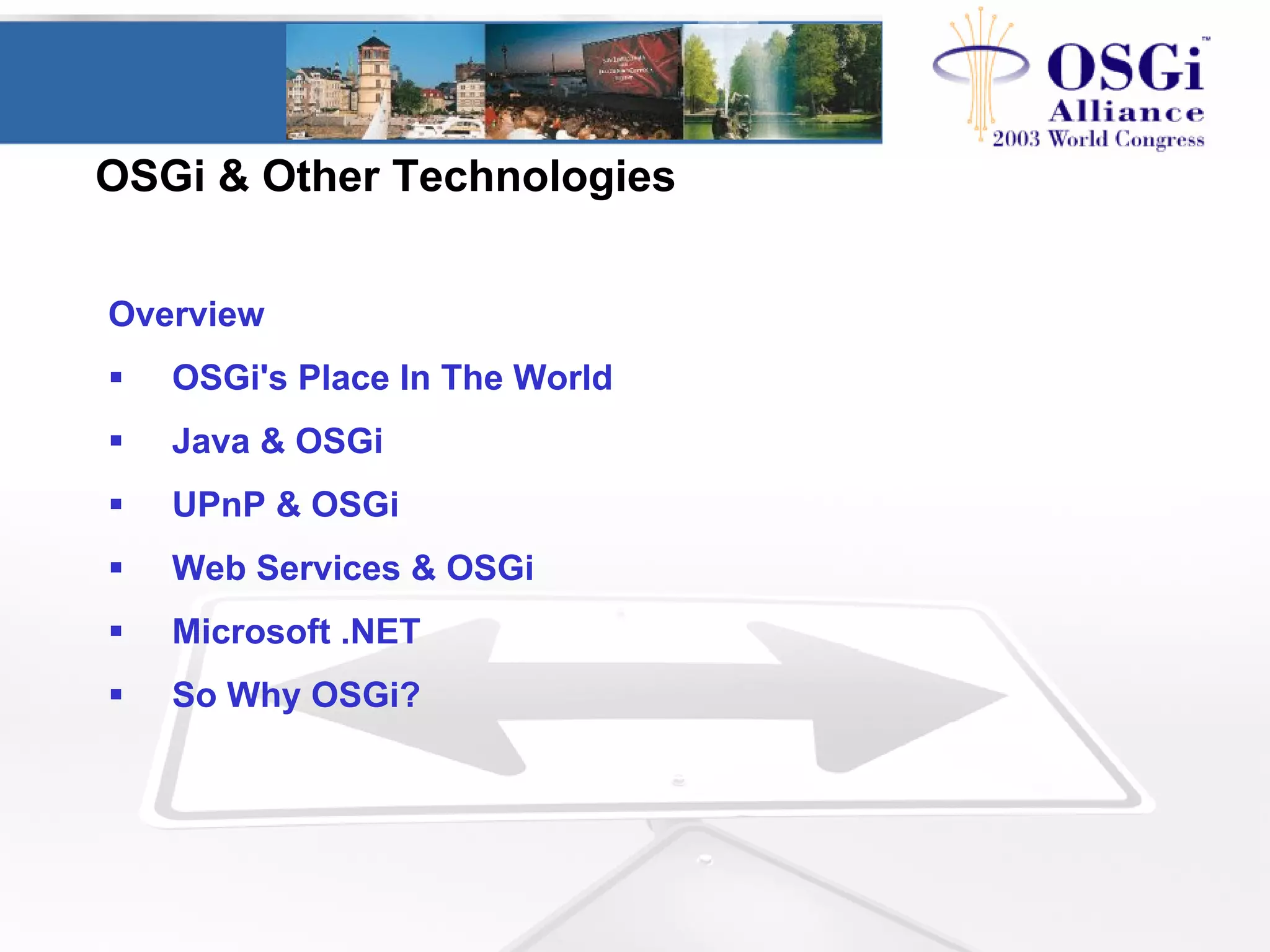 This document discusses OSGi and its relationship to other technologies like UPnP, web services, and .NET. It notes that OSGi provides a standardized Java environment and application model for networked devices, filling a gap. OSGi works well with UPnP by providing an execution environment for UPnP services. It also integrates well with web services. While .NET has similar advantages to Java, OSGi adds important features for remote management and diverse applications that .NET lacks. So OSGi is a good choice for connecting devices due to its interoperability, extensibility, and standardization.
