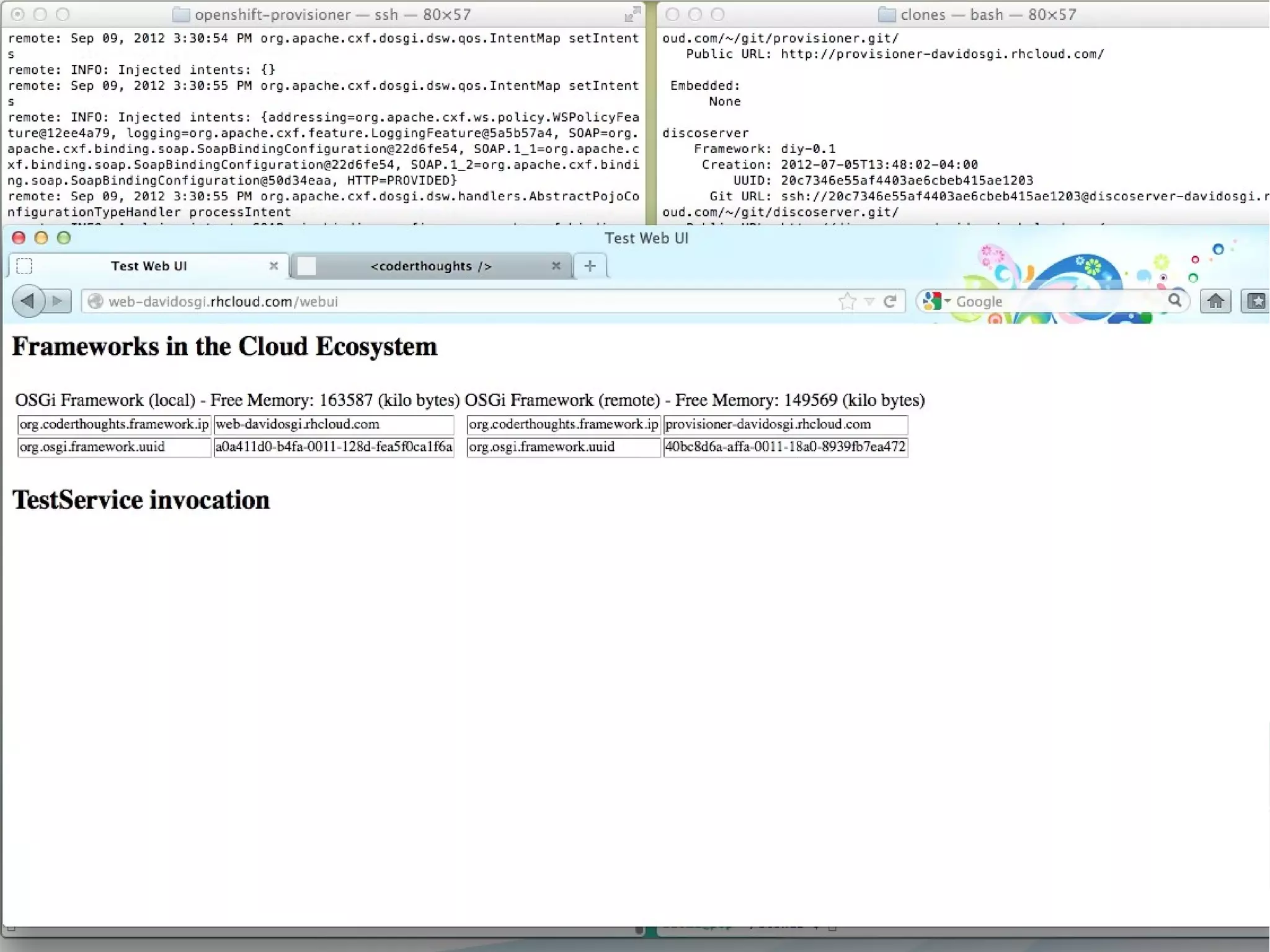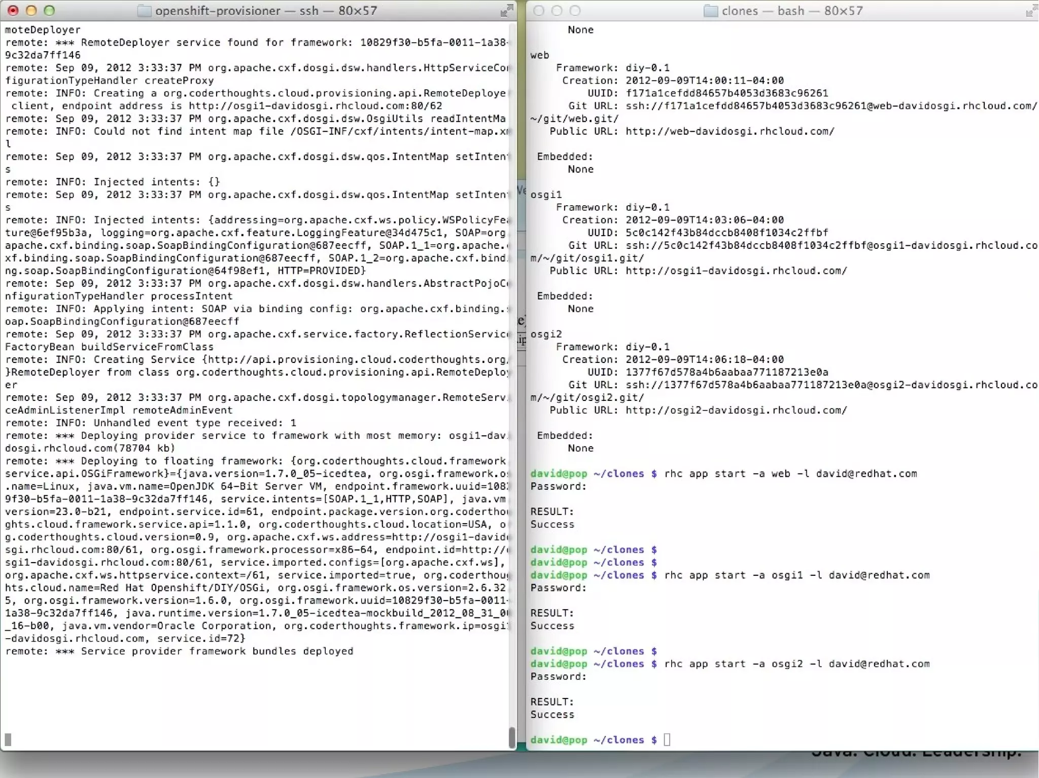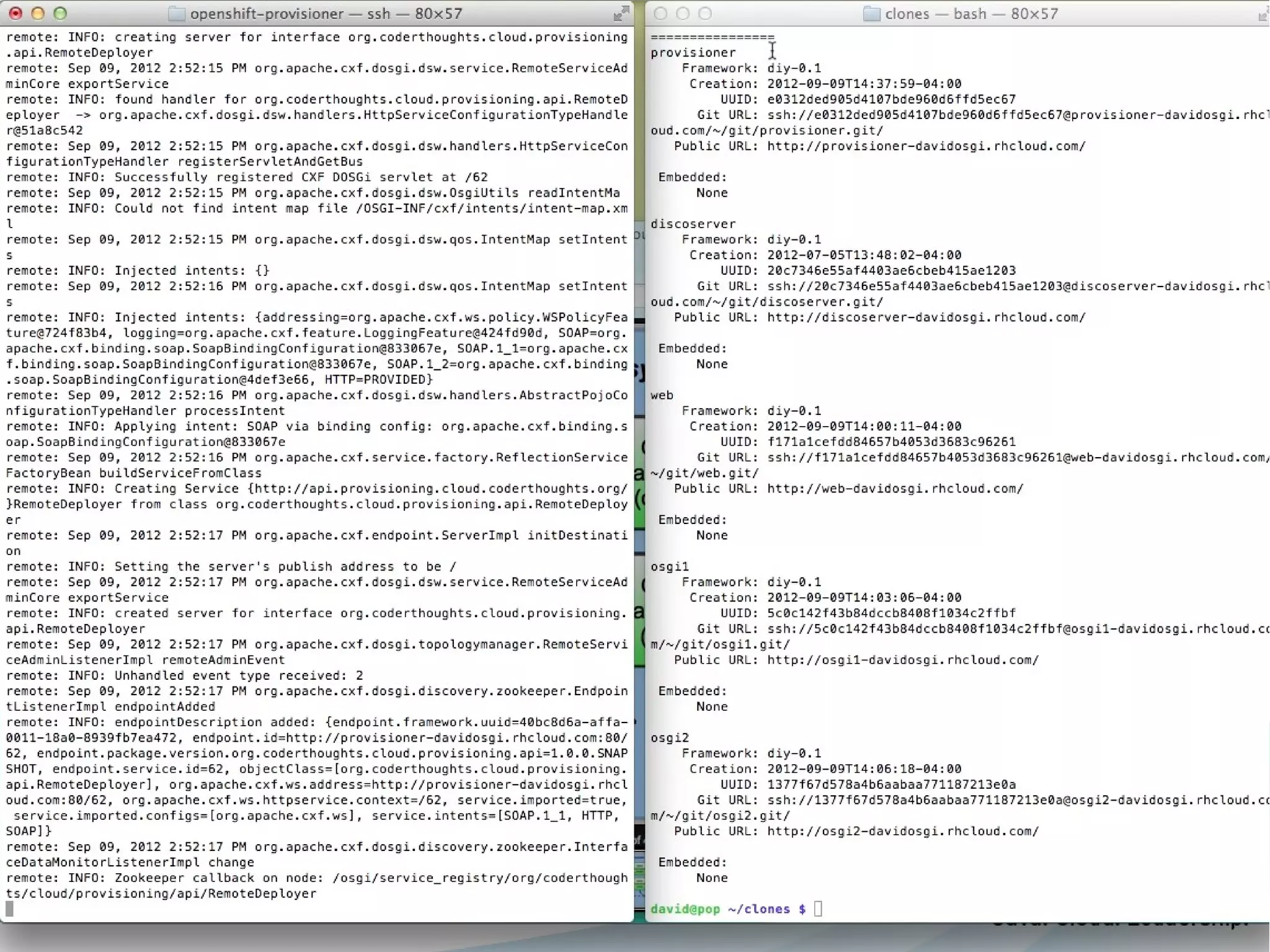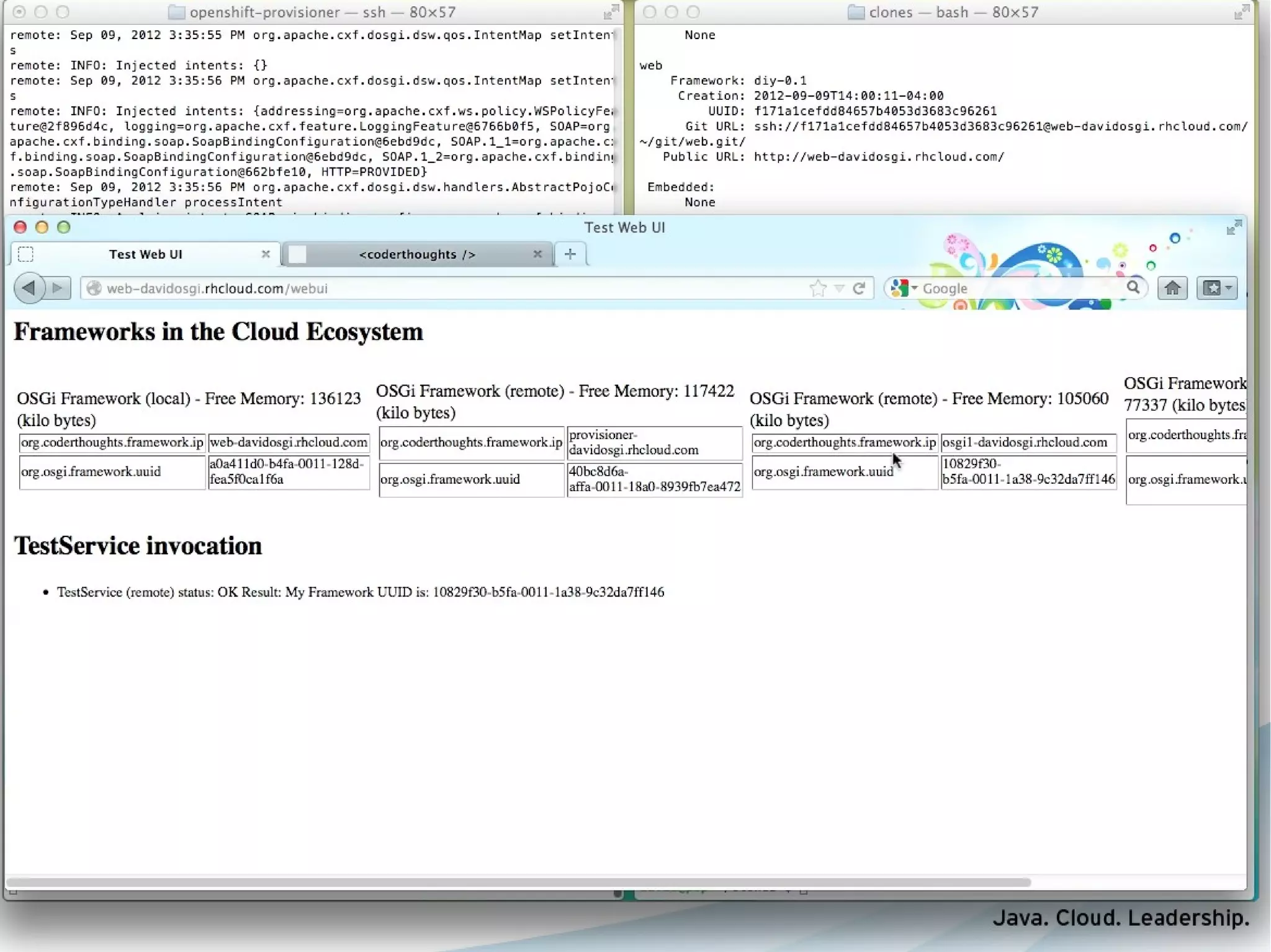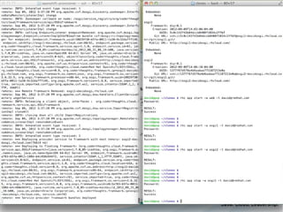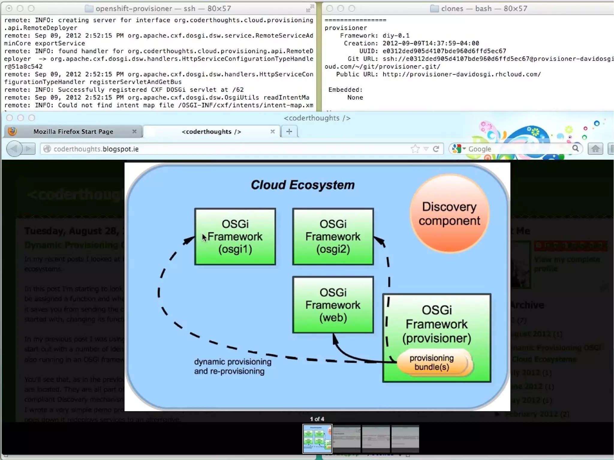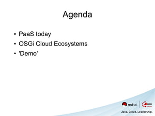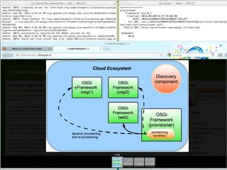 The document discusses the concept of OSGi cloud ecosystems and highlights the need for a more dynamic cloud environment where different nodes can work together as a single application. It presents examples of cloud-based applications and outlines the requirements for a provisioner that can orchestrate deployment and scaling. Additionally, it emphasizes the importance of using OSGi frameworks to create a fluid system that adapts to runtime changes without requiring reconfiguration by service consumers.