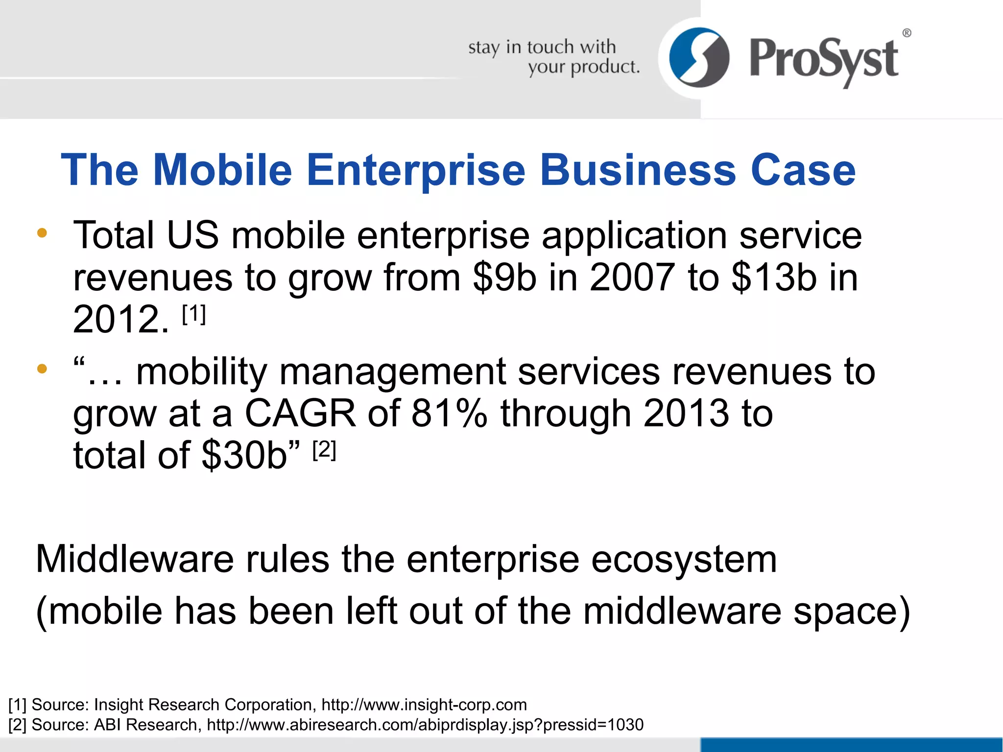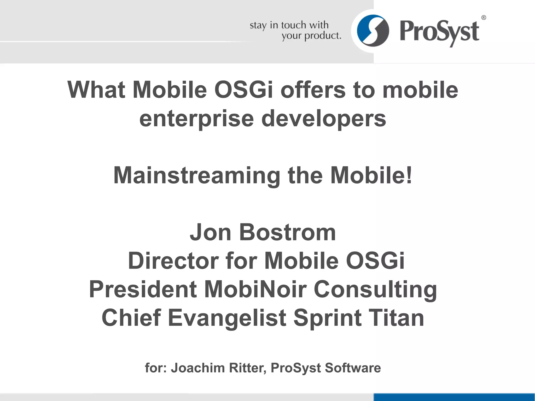 Mobile OSGi is a middleware platform that brings enterprise application capabilities to mobile devices. It allows developers to reuse existing Java skills and software assets to extend applications to mobile. Mobile OSGi supports security, multiple application models, and exposes device functionality to enable rich applications and services. It treats mobile devices as powerful managed servers that can create and distribute content at the edge of the computing cloud.