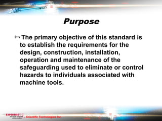 This document establishes requirements for safeguarding machine tools. It addresses guards, safeguarding devices, awareness devices, safe work procedures and other safety measures. It requires components to meet specific failure criteria to ensure safety functions are not compromised. It also provides guidelines for interlocks, presence sensing devices, muting, safety mats, emergency stops and complementary safety equipment. The goal is to eliminate hazards and control risks, though some risk cannot be entirely removed.