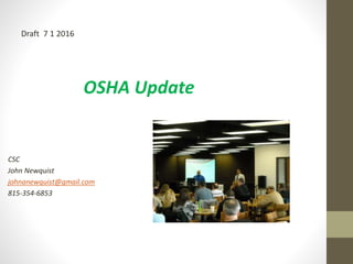 This document provides an overview of OSHA updates from 2015-2016, including changes to penalties, recordkeeping requirements, and strategic initiatives. Some key points: