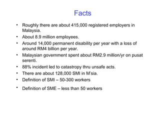 This document discusses occupational safety and health management systems. It provides facts about workplace injuries and costs in Malaysia. It then describes the Malaysian OSH-MS standard MS1722 and compares it to the international OSHAS 18001 standard. The document outlines guidelines from the International Labour Organization (ILO) for developing national OSH management frameworks and implementing OSH systems at the organizational level. It discusses key elements of an OSH system such as policy, worker participation, responsibilities, training, documentation and risk assessment.