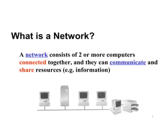 This document provides an introduction to networking concepts. It defines what a network is and explains the benefits of networking such as sharing information and centralizing administration. It describes different communication models and network components needed to set up a home network. Additionally, it discusses wired and wireless transmission media, network topologies, and the differences between peer-to-peer and client-server networks.
