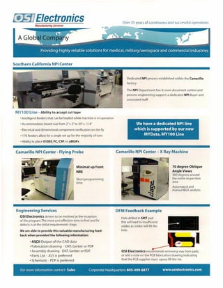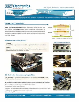 OSI Electronics has over 35 years of experience in electronics manufacturing. They have capabilities for package-on-package assembly and rework using advanced SMT equipment. Their facilities include reflow ovens, wave soldering, flying probe and X-ray machines. They also have a dedicated new product introduction center for supporting customers through the product development process.