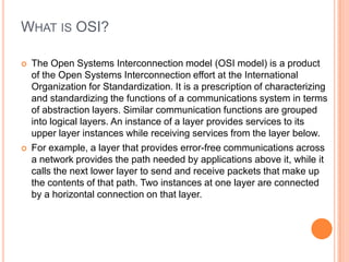 The document provides an overview of the OSI model, which defines 7 layers of abstraction for characterizing and standardizing network communication functions. It describes each of the 7 layers, including the physical, data link, network, transport, session, presentation and application layers. The physical layer defines electrical specifications for devices and transmission mediums. Higher layers deal with issues like routing, congestion control, session establishment, data encoding and common application protocols. The OSI model aimed to standardize network architectures but TCP/IP is now more widely used.