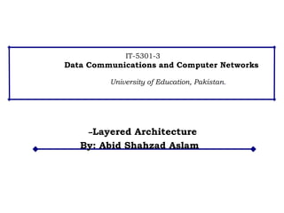The document discusses the layered architecture model known as the Open Systems Interconnection (OSI) model. The OSI model contains seven layers that each perform a specific communication function and rely on the layer below. It describes the functions of each layer, including the physical, data link, network, transport, session, presentation, and application layers. The layered design philosophy breaks communication tasks into simpler sub-tasks at each independent layer to standardize network communication.