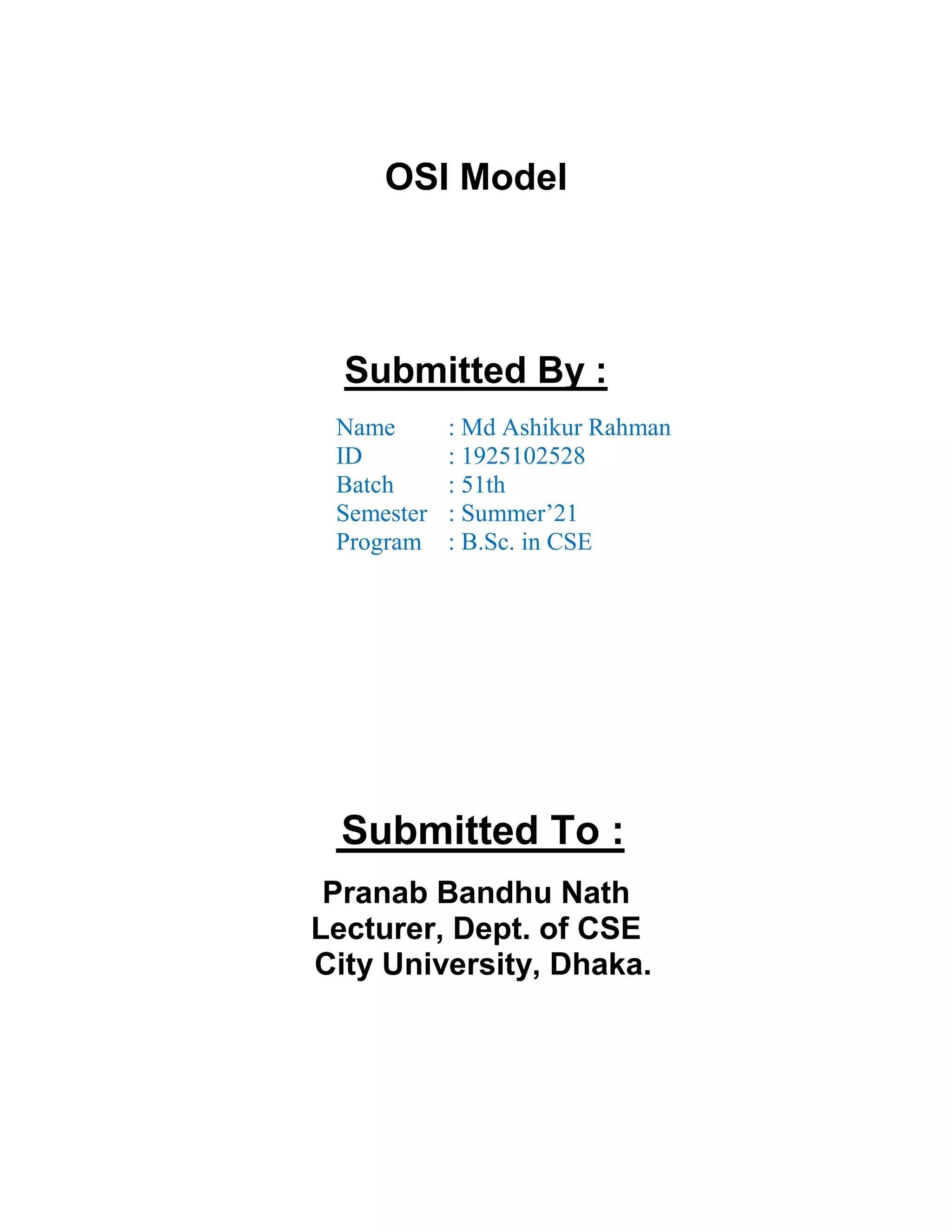 The document describes the seven-layer OSI model. It provides details about each layer, including the physical layer which transmits individual bits, the data link layer which provides error-free data transfer, the network layer which routes packets between devices, the transport layer which ensures reliable delivery of data, the session layer which establishes interactions between devices, and the presentation layer which converts data formats.