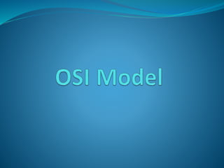 The document discusses the Open Systems Interconnection (OSI) reference model, which breaks down network communication into seven layers. The layers are application, presentation, session, transport, network, data link, and physical. Data flows from the top application layer down to the physical layer before being transmitted, and vice versa when received. Each layer uses protocol data units to communicate with its peer layer on another device.