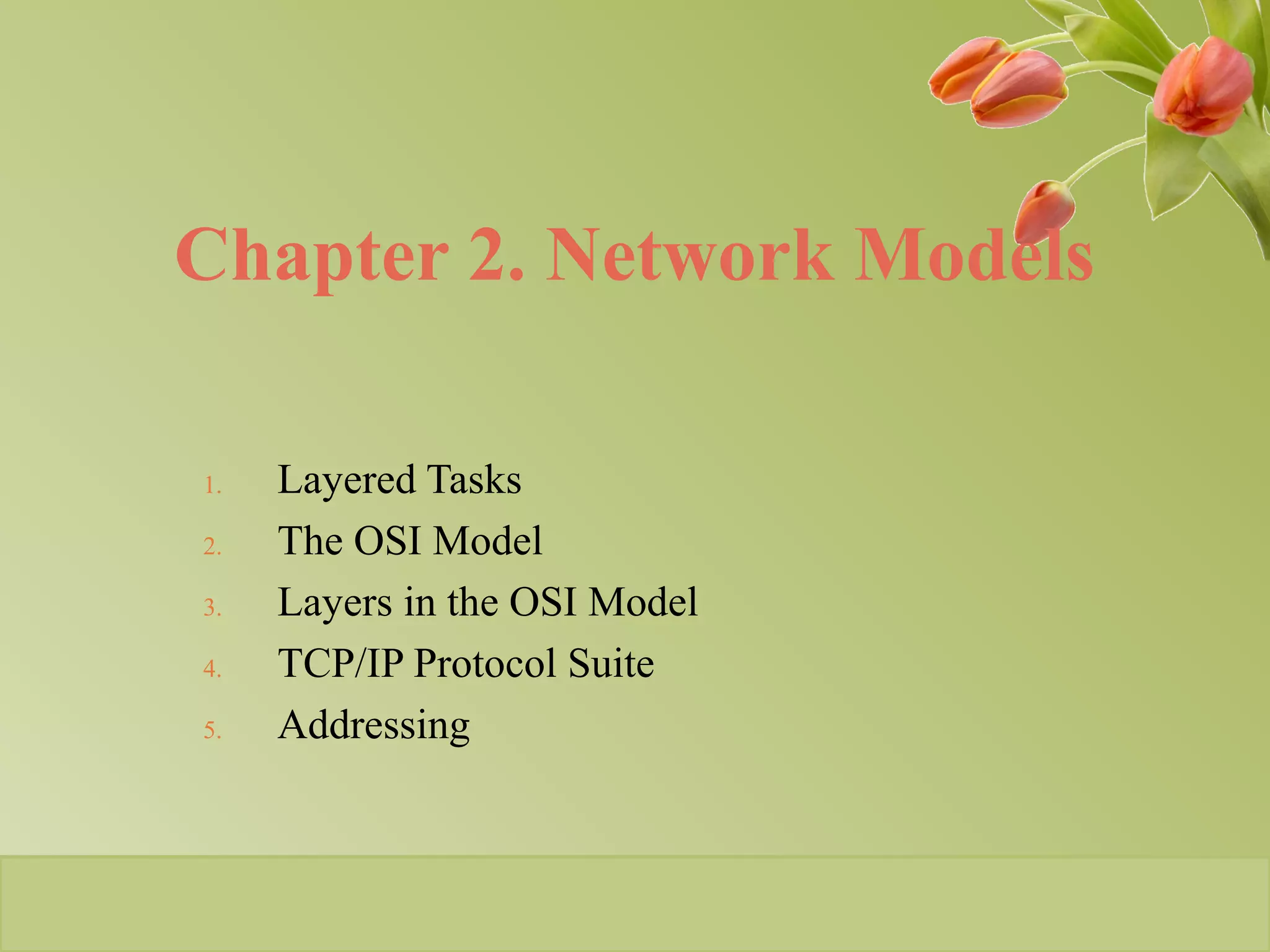 This document discusses network models and addressing in computer networks. It describes the OSI 7-layer model and its layers from physical to application layer. It also discusses the TCP/IP protocol suite and how it maps to the OSI model. Finally, it covers the different types of addressing used in networks, including physical, logical, port, and specific addresses.