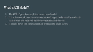 The OSI (Open Systems Interconnection) model is a framework for understanding data transmission in computer networking, divided into seven layers: Physical, Data Link, Network, Transport, Session, Presentation, and Application. Each layer has specific functions, with the upper layers focusing on application-related tasks and the lower layers on data transport issues. The model helps in organizing how data is handled and ensures reliable communication between devices.
