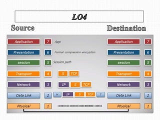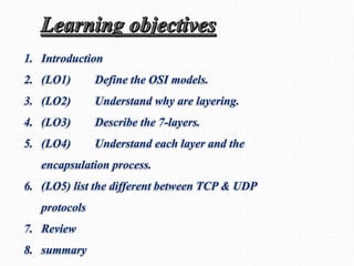 This document discusses the OSI model, which defines 7 layers of network communication. It defines each layer, their functions, and the encapsulation process between layers. Key points covered include defining the 7 layers and their functions, comparing TCP and UDP protocols, and stating that OSI model allows different hardware/software to communicate by organizing networks into well-defined modules. The purpose of OSI is to represent a perfect network and organize it into functional layers to allow troubleshooting and different technologies to work together across networks.