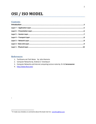 The document provides an overview of the 7-layer OSI model that is used to connect computers over a network. It describes each layer in order from the application layer down to the physical layer. The application layer allows user communication programs like web browsers, email clients, and file transfer protocols to operate. Lower layers deal with networking functions like packetizing data, routing, error checking, and physical connections between devices. The physical layer transmits the raw bit data over various transmission mediums like wires or fiber optics.