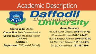 This document presents an academic description of the OSI reference model. It was created by a group of 5 students for their Data Communication course taught by Ms. Itisha Nowrin. The presentation will cover the 7 layers of the OSI model, including the physical, data link, network, transport, session, presentation, and application layers. It will also discuss what the OSI model is, how data flows through the layers, and provide a summary of the functions of each layer.