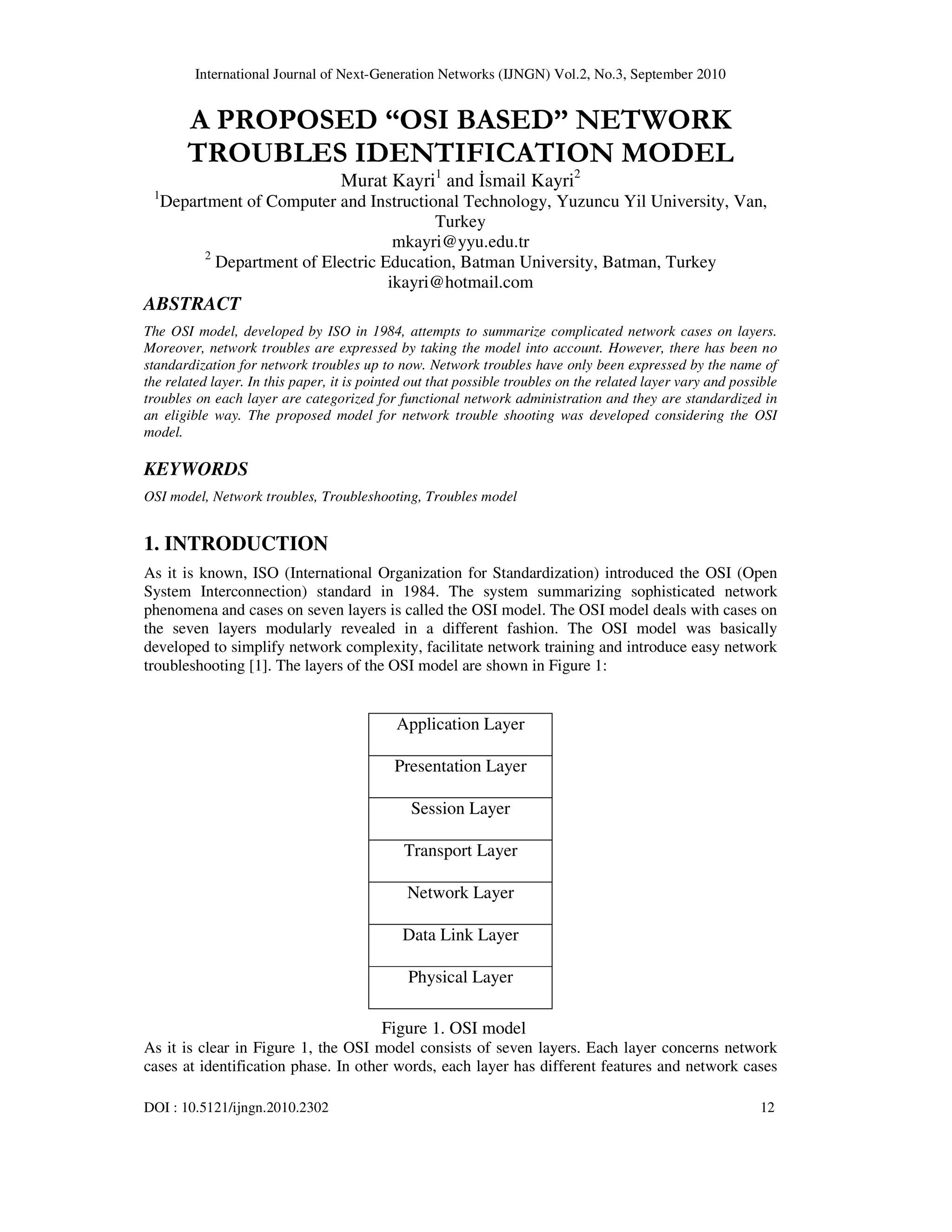This document proposes a model for classifying network troubleshooting issues according to the seven layers of the OSI model. It aims to standardize how network troubles are identified and expressed for more efficient network administration and troubleshooting. For each layer of the OSI model, the document categorizes the types of troubles that could occur on that layer. For example, on the Application layer troubles are divided into "Offline troubles" and "Online troubles", and on the Presentation layer they are divided into "Text troubles", "Audio troubles", and "Video-graphic troubles". The proposed model is intended to allow troubles to be identified at a more granular level for faster resolution of network issues.