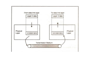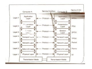 The OSI Reference Model describes a 7-layer network architecture developed by ISO to standardize network communication globally. It defines separate protocols for each layer to define tasks and responsibilities. The physical layer is responsible for sending bits between systems by defining encoding, transmission rates, and hardware details. The data link layer provides error checking, frame creation, and hardware addressing. The network layer establishes logical connections between systems, performs routing, handles addressing, and switches packets between networks.