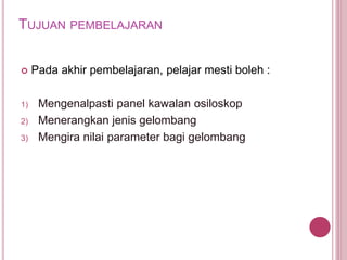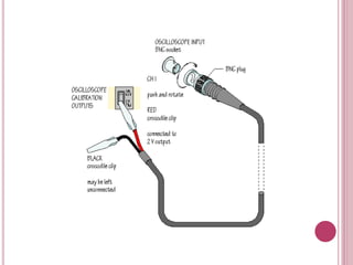 Osiloskop adalah alat pengukuran yang menunjukkan bentuk gelombang dan parameternya seperti voltan, frekuensi, tempoh, dan amplitud. Ia menggunakan paksi menegak untuk voltan dan paksi mendatar untuk masa untuk menunjukkan gelombang. Sebelum digunakan, osiloskop perlu dikalibrasi untuk mendapatkan bacaan yang tepat.