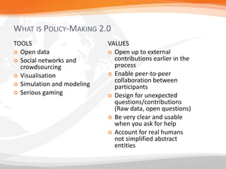 This document discusses how technology can enhance policy making through a process called "Policy Making 2.0". It describes tools like open data, social networks, and visualization that can enable more open and collaborative policy processes. The document provides examples of these tools being used for agenda setting, policy design, implementation, and evaluation. It also shares perspectives on involving the public and designing processes for average citizens, not just experts. The key message is that governments can innovate and experiment with new tools and approaches without full permission, through a process of continuous improvement.