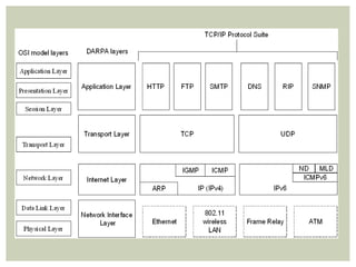 The document outlines the Open Systems Interconnection (OSI) model, detailing its seven layers, each responsible for specific networking functions such as data formatting, error control, and routing. It explains how layers interact with one another and emphasizes the importance of protocols in facilitating communication between computers. The layers include physical, data link, network, transport, session, presentation, and application, with each layer adding information to data packets for effective communication.