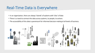 The document discusses real-time data and the PI System for managing it. The PI System collects real-time data from various sources, historizes large volumes of data reliably over long periods, and allows users to find, analyze, deliver, and visualize the data. It provides a comprehensive view of operational information through intuitive visuals to help users make informed decisions.