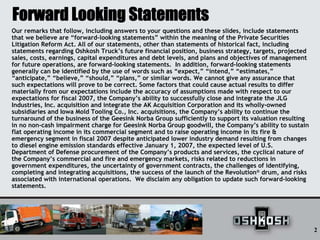 Oshkosh Truck Corporation presented an investor presentation on its proposed acquisition of JLG Industries, Inc. The presentation discussed Oshkosh's track record of successful acquisitions and shareholder value creation. It also outlined the objectives of acquiring JLG to support growth above 15%, diversify into the fast-growing aerial work platform market, and execute its long-term acquisition strategy. Finally, the presentation provided an overview of Oshkosh Truck Corporation and its proven strategy of new product leadership, operational excellence, and strategic acquisitions that have fueled strong sales and earnings growth.