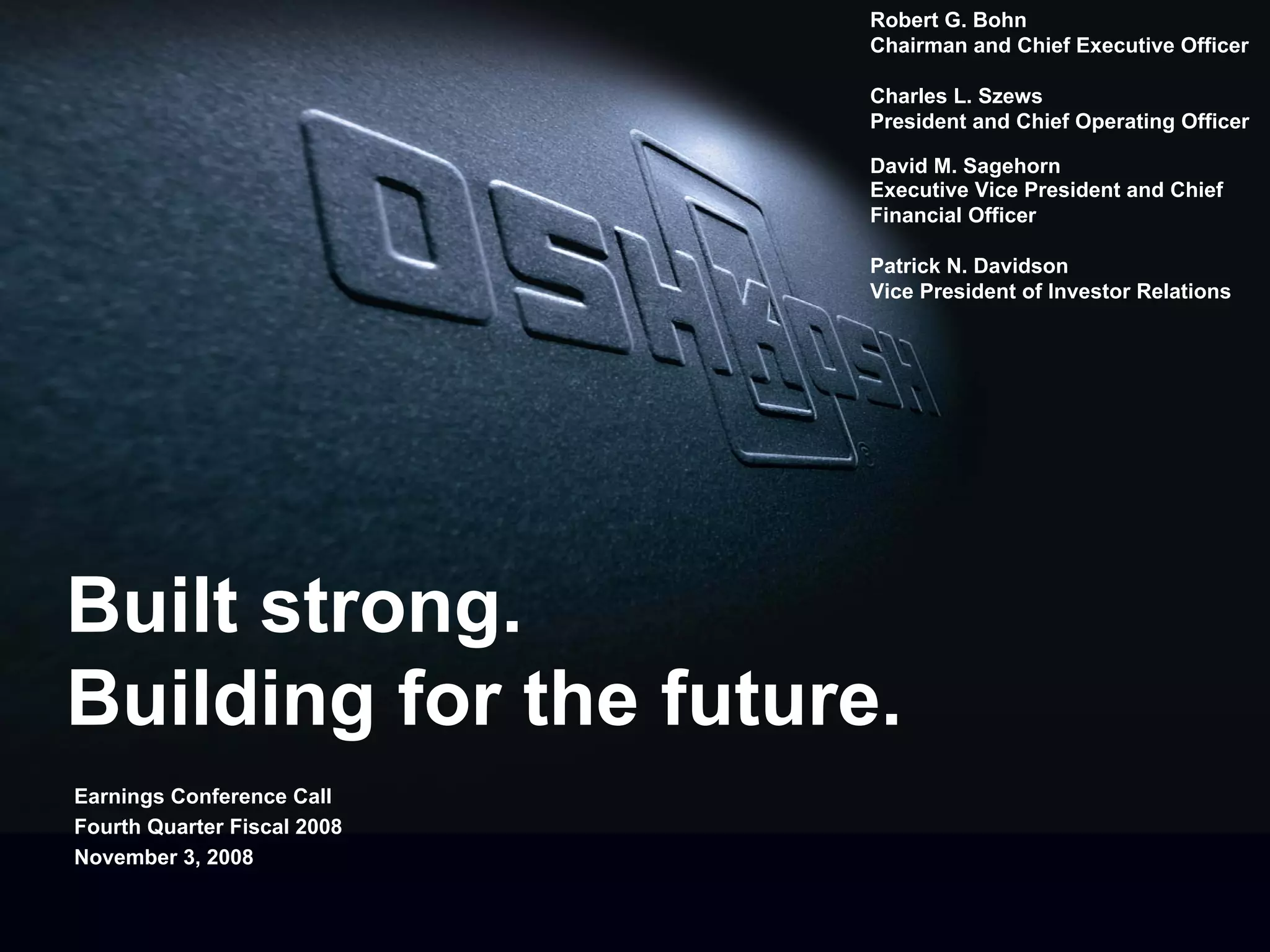 This document is the transcript from Oshkosh Corporation's earnings conference call for the fourth quarter of fiscal year 2008. It discusses Oshkosh's financial results for Q4 and fiscal year 2008, including sales, operating income, earnings per share, and debt reduction. It also provides an outlook for fiscal year 2009, estimating revenues of $6.3-6.7 billion, operating income of $350-400 million, and EPS of $1.65-2.05. The transcript reviews performance and outlook for each of Oshkosh's business segments and discusses its financing plans.