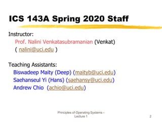 This document provides an overview of an introductory lecture on operating systems principles. It introduces the course, including the instructor, teaching assistants, schedule, textbook, and grading policy. It also covers basic topics that will be discussed over the course of the term, such as operating system structures and functions, components of a computer system, goals of an operating system, and the history of operating systems from early batch systems to modern parallel and distributed systems.
