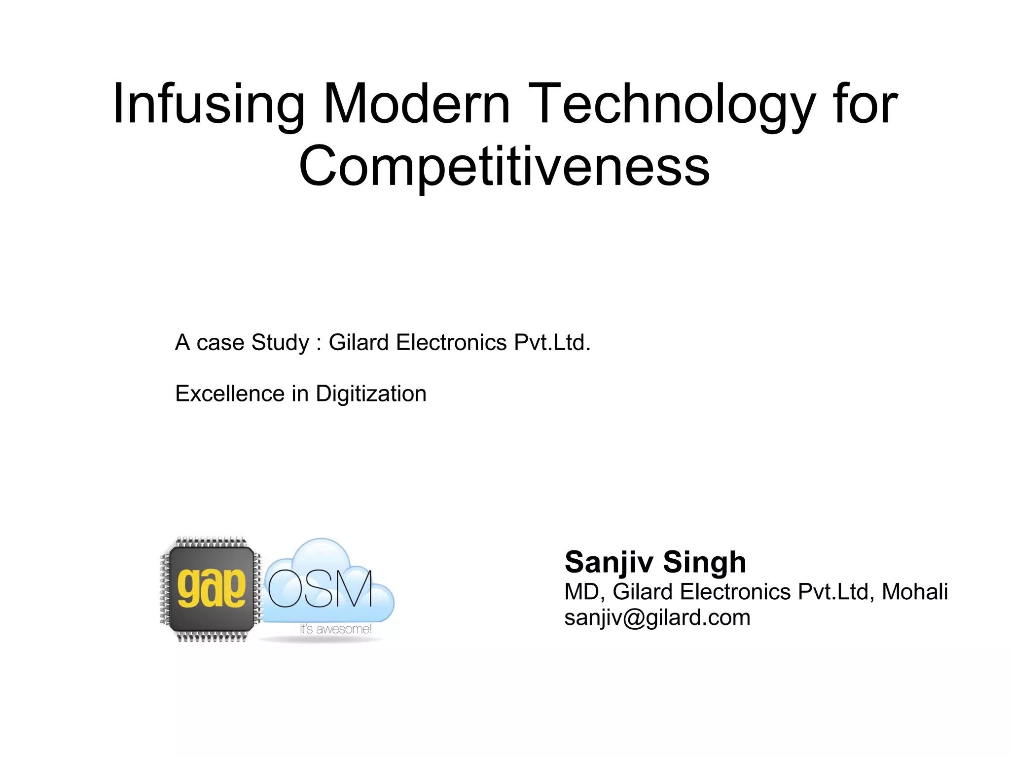 This document describes how Gilard Electronics Pvt. Ltd., an Indian electronics manufacturer, infused modern technology like digitization and IoT to improve competitiveness. It details how Gilard implemented an ERP system in 1987 to digitize operations like production planning and inventory control. In 2015, Gilard upgraded to newer ERP technologies and added IoT sensors to digitally monitor and control manufacturing processes. Now Gilard's entire operations from new product development to sales and finance are digitized and integrated on a central database for real-time access and decision making. The digitization helps Gilard improve quality, productivity, efficiency and reduce costs to better compete in a challenging market.