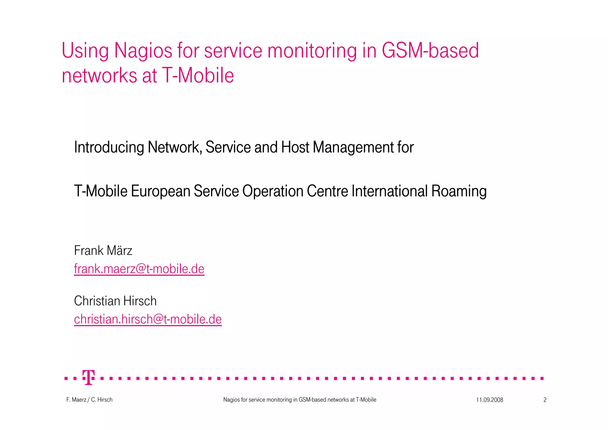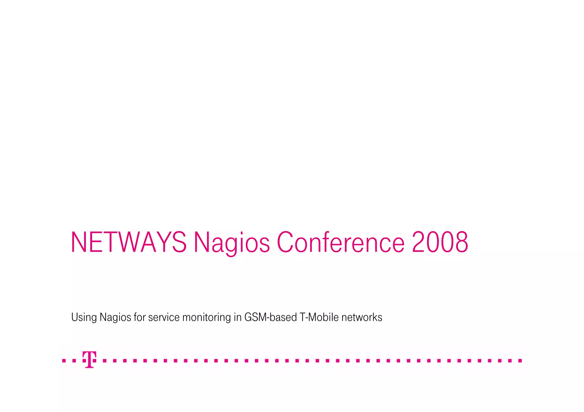 The document discusses the use of Nagios for service monitoring in T-Mobile's GSM-based networks, detailing its implementation for maintaining service quality in international roaming operations. It outlines various layers of monitoring, including connectivity checks, performance analysis, and the historical development of Nagios within T-Mobile's infrastructure. The document emphasizes Nagios' capability to execute comprehensive checks every five minutes, ensuring effective monitoring across multiple networks globally.