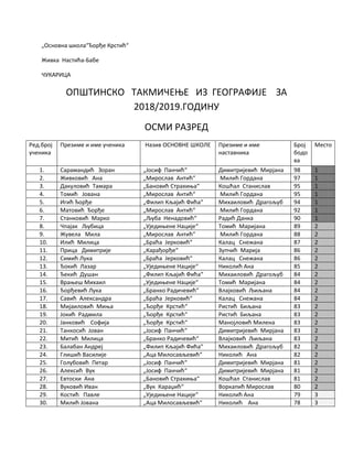 Настића-Бабе ЧУКАРИЦА ОПШТИНСКО ТАКМИЧЕЊЕ ИЗ ГЕОГРАФИЈЕ ЗА 2018/2019.ГОДИНУ ОСМИ РАЗРЕД Ред.број ученика Презиме и име ученика Назив ОСНОВНЕ ШКОЛЕ Презиме и име наставника Број бодо ва Место 1. Сарамандић Зоран „Јосиф Панчић“ Димитријевић Мирјана 98 1 2. Живковић Ана „Мирослав Антић“ Милић Гордана 97 1 3. Дакуловић Тамара „Бановић Страхиња“ Кошћал Станислав 95 1 4. Томић Јована „Мирослав Антић“ Милић Гордана 95 1 5. Игић Ђорђе „Филип Кљајић Фића“ Михаиловић Драгољуб 94 1 6. Матовић Ђорђе „Мирослав Антић“ Милић Гордана 92 1 7. Станковић Марко „Љуба Ненадовић“ Радић Данка 90 1 8. Чпајак Љубица „Уједињене Нације“ Томић Маријана 89 2 9. Жувела Мила „Мирослав Антић“ Милић Гордана 88 2 10. Илић Милица „Браћа Јерковић“ Калац Снежана 87 2 11. Прица Димитрије „Карађорђе“ Зупчић Марија 86 2 12. Симић Лука „Браћа Јерковић“ Калац Снежана 86 2 13. Ђокић Лазар „Уједињене Нације“ Николић Ана 85 2 14. Ђекић Душан „Филип Кљајић Фића“ Михаиловић Драгољуб 84 2 15. Врањеш Михаил „Уједињене Нације“ Томић Маријана 84 2 16. Ђорђевић Лука „Бранко Радичевић“ Влајковић Љиљана 84 2 17. Савић Александра „Браћа Јерковић“ Калац Снежана 84 2 18. Мијаиловић Миња „Ђорђе Крстић“ Ристић Биљана 83 2 19. Јокић Радмила „Ђорђе Крстић“ Ристић Биљана 83 2 20. Јанковић Софија „Ђорђе Крстић“ Манојловић Милена 83 2 21. Танкосић Јован „Јосиф Панчић“ Димитријевић Мирјана 83 2 22. Митић Милица „Бранко Радичевић“ Влајковић Љиљана 83 2 23. Балабан Андреј „Филип Кљајић Фића“ Михаиловић Драгољуб 82 2 24. Глишић Василије „Аца Милосављевић“ Николић Ана 82 2 25. Голубовић Петар „Јосиф Панчић“ Димитријевић Мирјана 81 2 26. Алексић Вук „Јосиф Панчић“ Димитријевић Мирјана 81 2 27. Евтоски Ана „Бановић Страхиња“ Кошћал Станислав 81 2 28. Вуковић Иван „Вук Караџић“ Воркапић Мирослав 80 2 29. Костић Павле „Уједињене Нације“ Николић Ана 79 3 30. Милић Јована „Аца Милосављевић“ Николић Ана 78 3