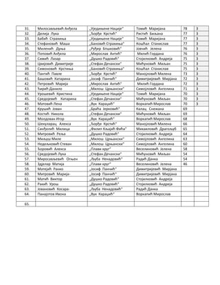 „Уједињене Нације“ Томић Маријана 78 3 32. Делија Лука „Ђорђе Крстић“ Ристић Биљана 77 3 33. Бабић Страхиња „Уједињене Нације“ Томић Маријана 77 3 34. Стефановић Маша „Бановић Страхиња“ Кошћал Станислав 77 3 35. Миленић Дуња „Руђер Бпшковић“ Јовчић Јелена 76 3 36. Поповић Анђела „Мирослав Антић“ Милић Гордана 76 3 37. Симић Лазар „Душко Радовић“ Стојилковић Андреја 75 3 38. Цвијовић Димитрије „Стефан Дечански“ Мићуновић Миљан 75 3 39. Симоновић Крстиња „Бановић Страхиња“ Кошћал Станислав 75 3 40. Пантић Павле „Ђорђе Крстић“ Манојловић Милена 73 3 41. Башовић Катарина „Јосиф Панчић“ Димитријевић Мирјана 72 3 42. Петровић Марија „Мирослав Антић“ Милић Гордана 72 3 43. Ћирић Данило „Милош Црњански“ Симојловић Ангелина 71 3 44. Урошевић Кристина „Уједињене Нације“ Томић Маријана 70 3 45. Средојевић Катарина „Стефан Дечански“ Мићуновић Миљан 70 3 46. Матовић Лена „Вук Караџић“ Воркапић Мирослав 70 3 47. Крушић Јован „Браћа Јерковић“ Калац Снежана 69 48. Костић Никола „Стефан Дечански“ Мићуновић Миљан 69 49. Молдован Игор „Вук Караџић“ Воркапић Мирослав 68 50. Шекуларац Алекса „Ђорђе Крстић“ Манојловић Милена 66 51. Синђелић Милица „Филип Кљајић Фића“ Михаиловић Драгољуб 65 52. Митровић Реља „Душко Радовић“ Стојилковић Андреја 64 53. Миљуш Миле „Милош Црњански“ Симојловић Ангелина 63 54. Недељковић Стеван „Милош Црњански“ Симојловић Ангелина 60 55. Ђоровић Алекса „Плави круг“ Веселиновић Јелена 58 56. Средојевић Лука „Стефан Дечански“ Мићуновић Миљан 54 57. Миросављевић Огњен „Љуба Ненадовић“ Радић Данка 54 58. Здјелар Матија „Плави круг“ Веселиновић Јелена 46 59. Матејић Ранко „Јосиф Панчић“ Димитријевић Мирјана 60. Митровић Марија- „Јосиф Панчић“ Димитријевић Мирјана 61. Матић Виктор „Душко Радовић“ Стојилковић Андреја 62. Ракић Урош „Душко Радовић“ Стојилковић Андреја 63. Јовановић Косара- „Љуба Ненадовић“ Радић Данка 64. Панајотов Ивона „Вук Караџић“ Воркапић Мирослав 65.