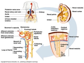 This document discusses osmoregulation and excretion in animals. It describes how different organisms produce nitrogenous waste and regulate water and solute levels. The mammalian kidney is highlighted, with nephrons filtering blood to form urine via selective reabsorption and secretion. Key parts of the nephron work together to concentrate urine by actively transporting water and solutes like urea and NaCl. Hormones like ADH and aldosterone help the kidney regulate water and salt levels in response to osmolarity and blood pressure changes. The functions of the kidney are vital for homeostasis and common disorders like kidney stones and infections are also outlined.
