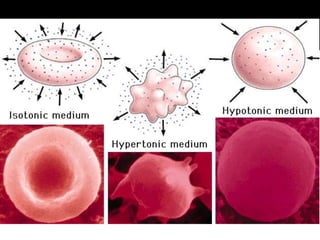 Cells control what enters and leaves through the cell membrane. Diffusion occurs when molecules move from areas of higher concentration to lower concentration until concentrations are equalized. Osmosis is the diffusion of water through the semipermeable cell membrane. In hypertonic solutions, cells shrink as water diffuses out. In hypotonic solutions, cells swell as water diffuses in. In isotonic solutions, there is no net water movement as concentrations are balanced.