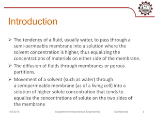 The document discusses osmotic power generation through salinity gradient power. It describes two main methods - pressure retarded osmosis (PRO) and reverse electrodialysis. PRO involves pumping seawater and freshwater into a pressure chamber separated by a membrane, where the pressure differences drive a turbine. Reverse electrodialysis uses a series of alternating cation and anion exchange membranes to generate electricity from the free energy of river and seawater. While still being researched, these methods harness the natural process of osmosis to generate renewable energy from salinity gradients between fresh and salt water sources.