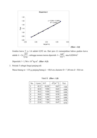 Eksperimen mengukur periode osilasi batang yang digantungkan oleh dua tali paralel dengan variasi jarak antar tali dan panjang tali. Hasilnya menunjukkan hubungan yang linier antara periode dengan kebalikan jarak dan kuadrat akar panjang tali. Perhitungan momen inersia batang dari data eksperimen hanya berbeda kurang dari 8% dari nilai teori.