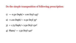 This document discusses the rules for transposing eyeglass prescriptions and determining the type of astigmatism. It provides examples of how to:
