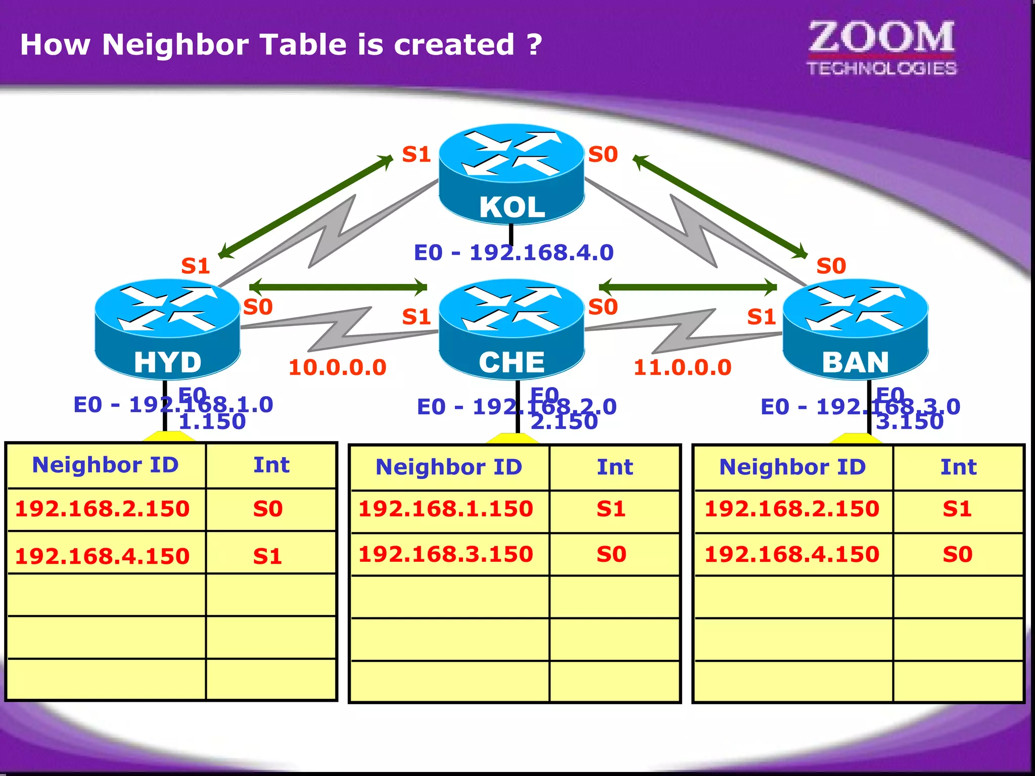 The document explains the creation of neighbor, topology, and routing information tables in a network, detailing neighbor IDs and link IDs for various networks. It also discusses the impact on these tables when network links go down, affecting the best path for data transmission. Additionally, the document illustrates the costs associated with different paths and how they change under various network conditions.