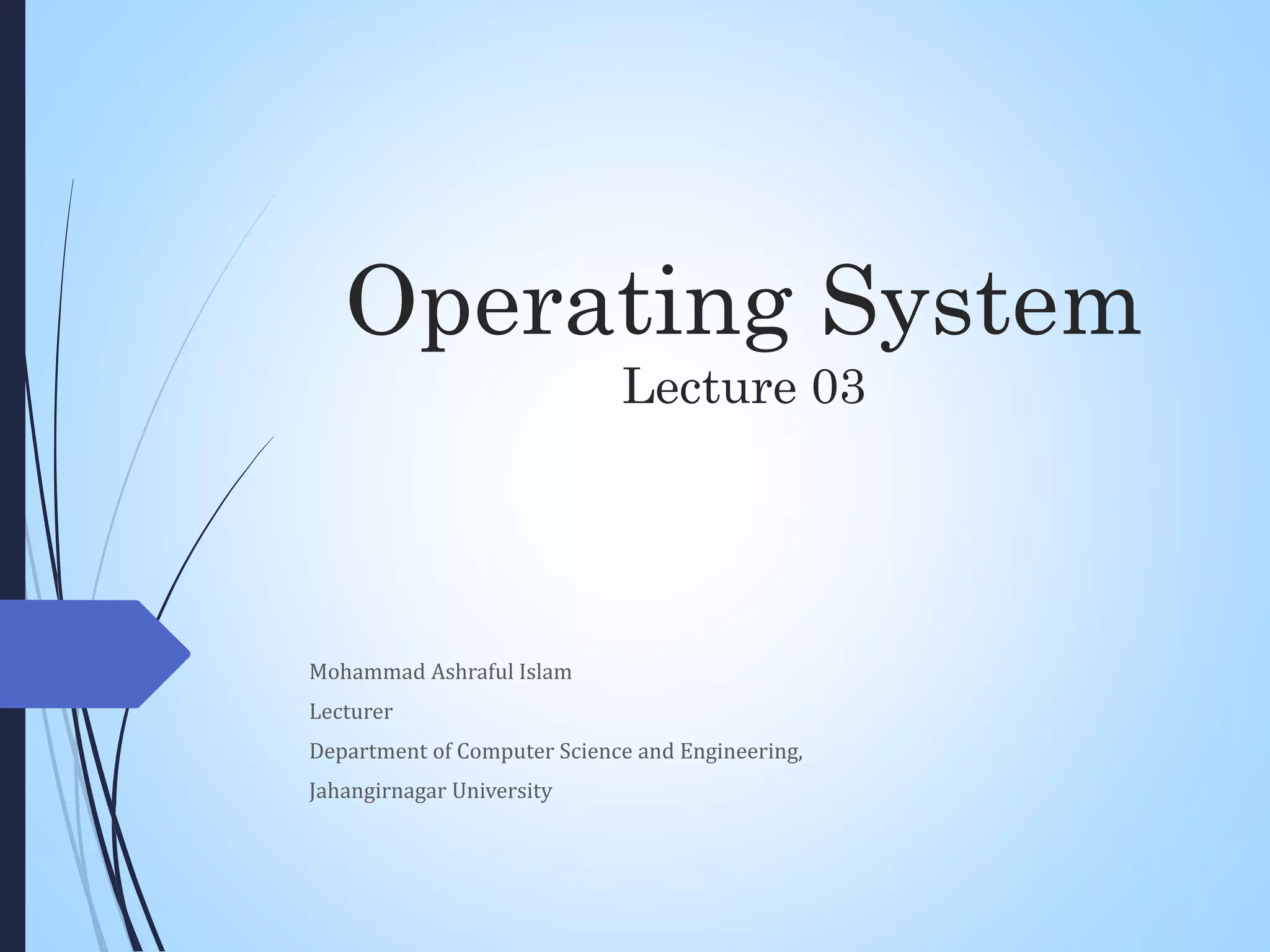 This document provides an overview of operating system processes. It discusses what a process is, how process memory is divided, the different states a process can be in (new, running, waiting, ready, suspended, terminated), and the process control block that contains information about each process. It also covers process scheduling, including different scheduling categories (preemptive and non-preemptive), the scheduling queues, and types of schedulers (long term, short term, medium term). Additionally, it discusses context switching, process creation and termination, and the different times associated with processes like arrival time, burst time, completion time, turnaround time, waiting time, and response time.