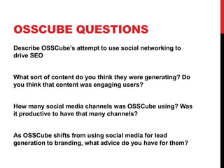 OSSCube previously used multiple social media channels to generate content and drive search engine optimization, but is now shifting their focus to using social media for branding purposes. Their content on social media platforms was likely promotional in nature to generate leads rather than truly engaging users. As they transition to branding, focusing quality content across fewer key channels aligned with their target audience would likely be more productive than spreading efforts across many platforms.