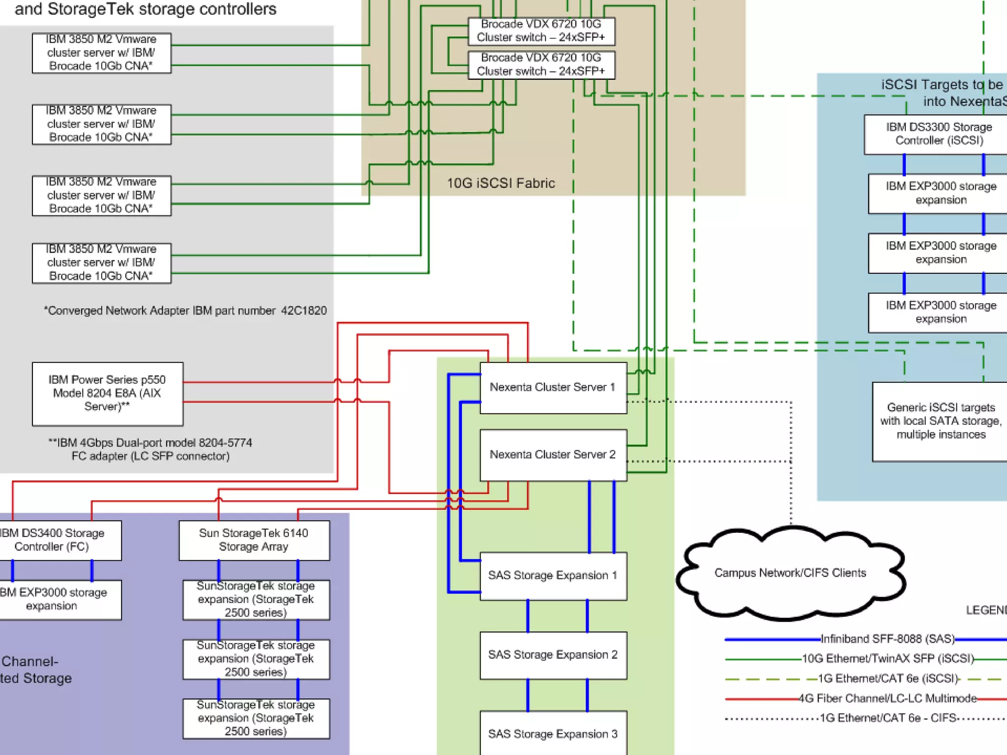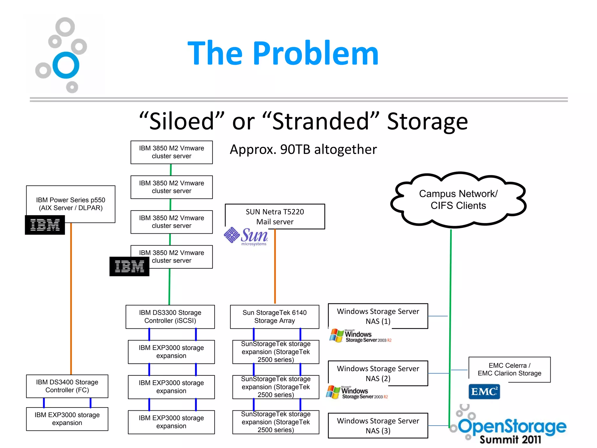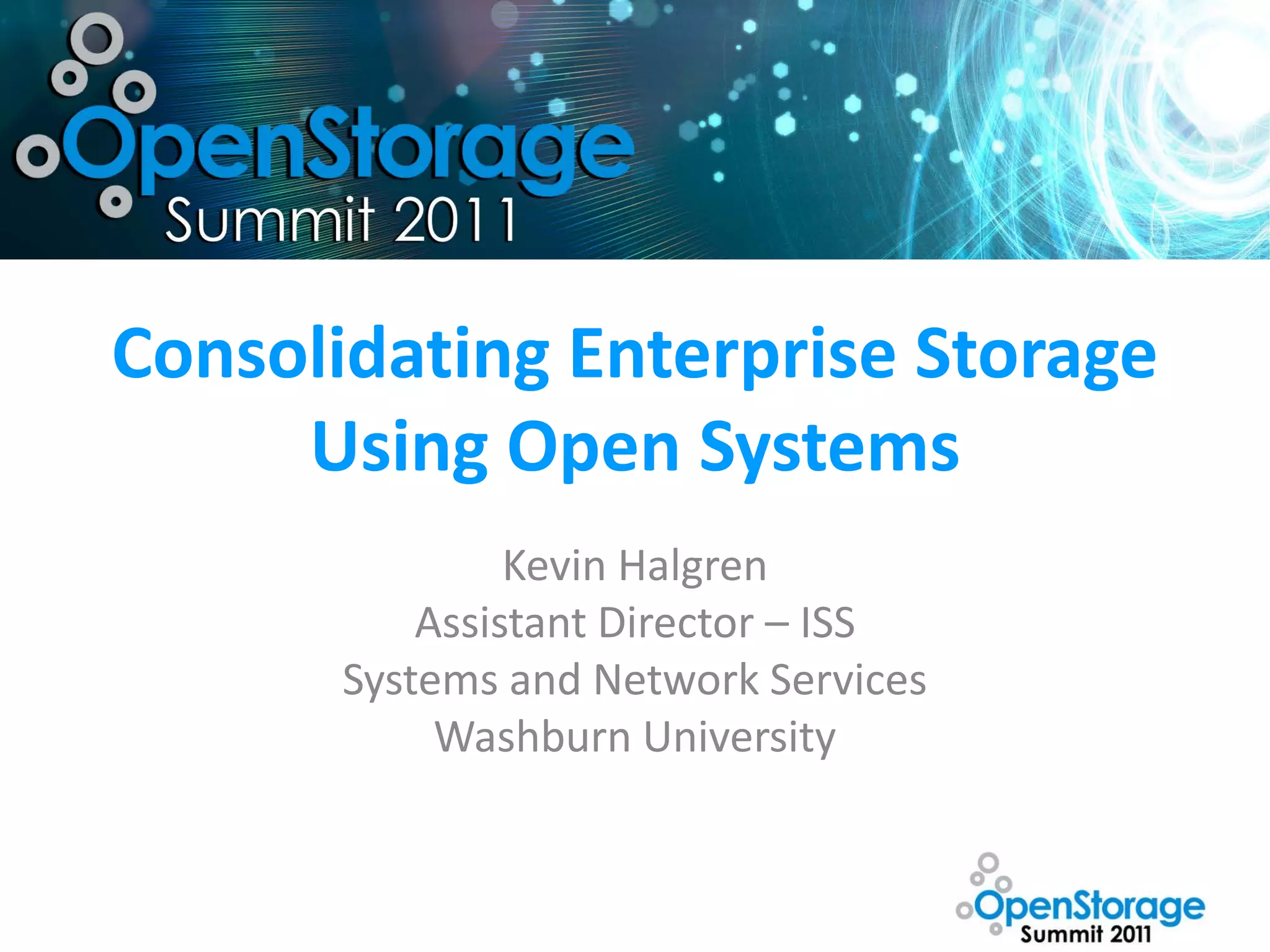 The document summarizes Washburn University's efforts to consolidate its enterprise storage using an open source storage solution called Nexenta. It describes the university's existing fragmented storage environment consisting of various vendors and protocols. The implementation plan involves acquiring an initial Nexenta cluster and storage expansions, building an iSCSI fabric, migrating CIFS/NFS storage, integrating VMware, and connecting a fiber channel server. The end goal is to manage all storage and backups through a single Nexenta interface using the data integrity and flexibility benefits of the ZFS file system.