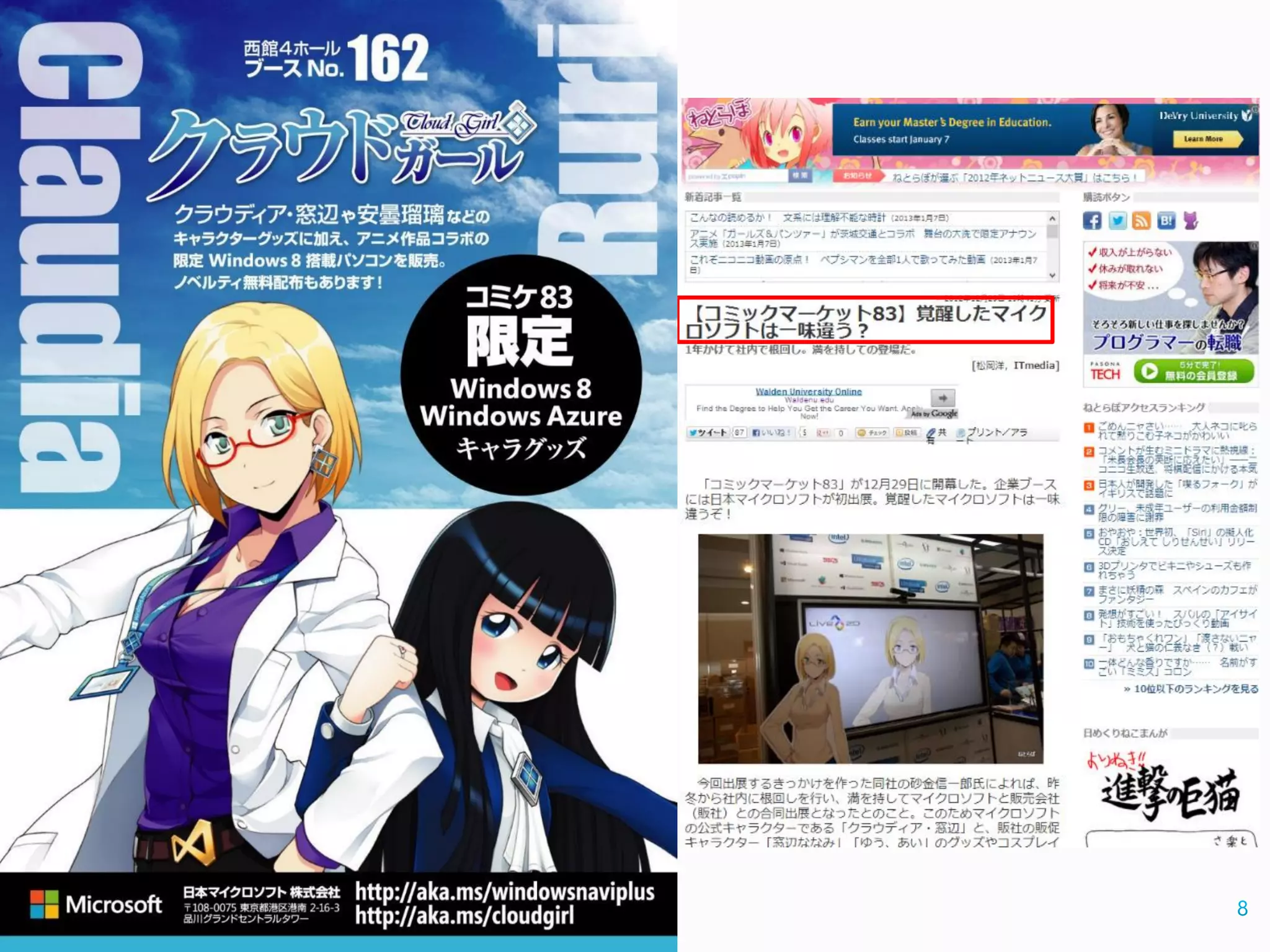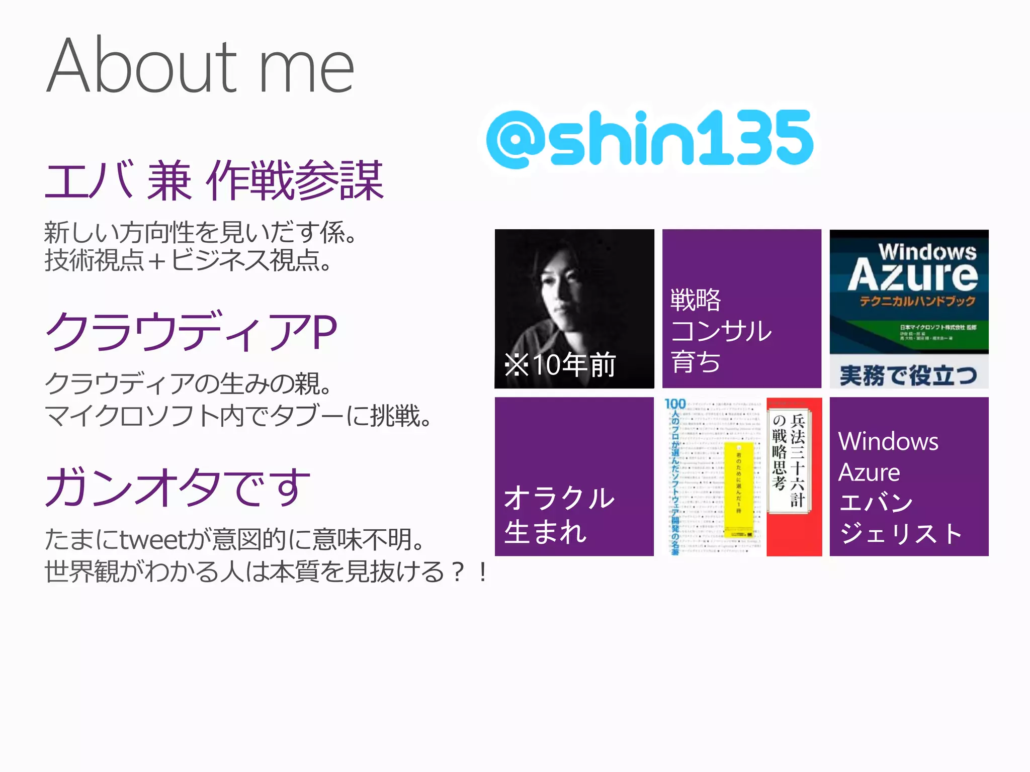 Azureのビジョンに惹かれマイクロソフトにエバンジェリストとして入社 • 数々のイベントを構成作家的立場で演出 • ブログ、twitter、Facebookなどを積極活用 • AWS、GAEなどとクラウド黎明期を盛り立てる • アワード受賞 • 戦力不足を自覚して仲間を召喚 • JAZUG創立支援、Azure MVPs擁立 • おばかアプリ選手権やインストールマニアックスを通じた出会い • プロジェクトAZUMAP • クラウド・ガールを企画、原作、プロデュース • モバイル向けコンテンツ配信ビジネスの立ち上げ • ソーシャル領域でのビジネスの立ち上げ • Mashup Awardなどを通じたWeb方面の市場開拓 • VCと連携したスタートアップ企業支援 • コミケ出展 • スマート XXプロジェクト