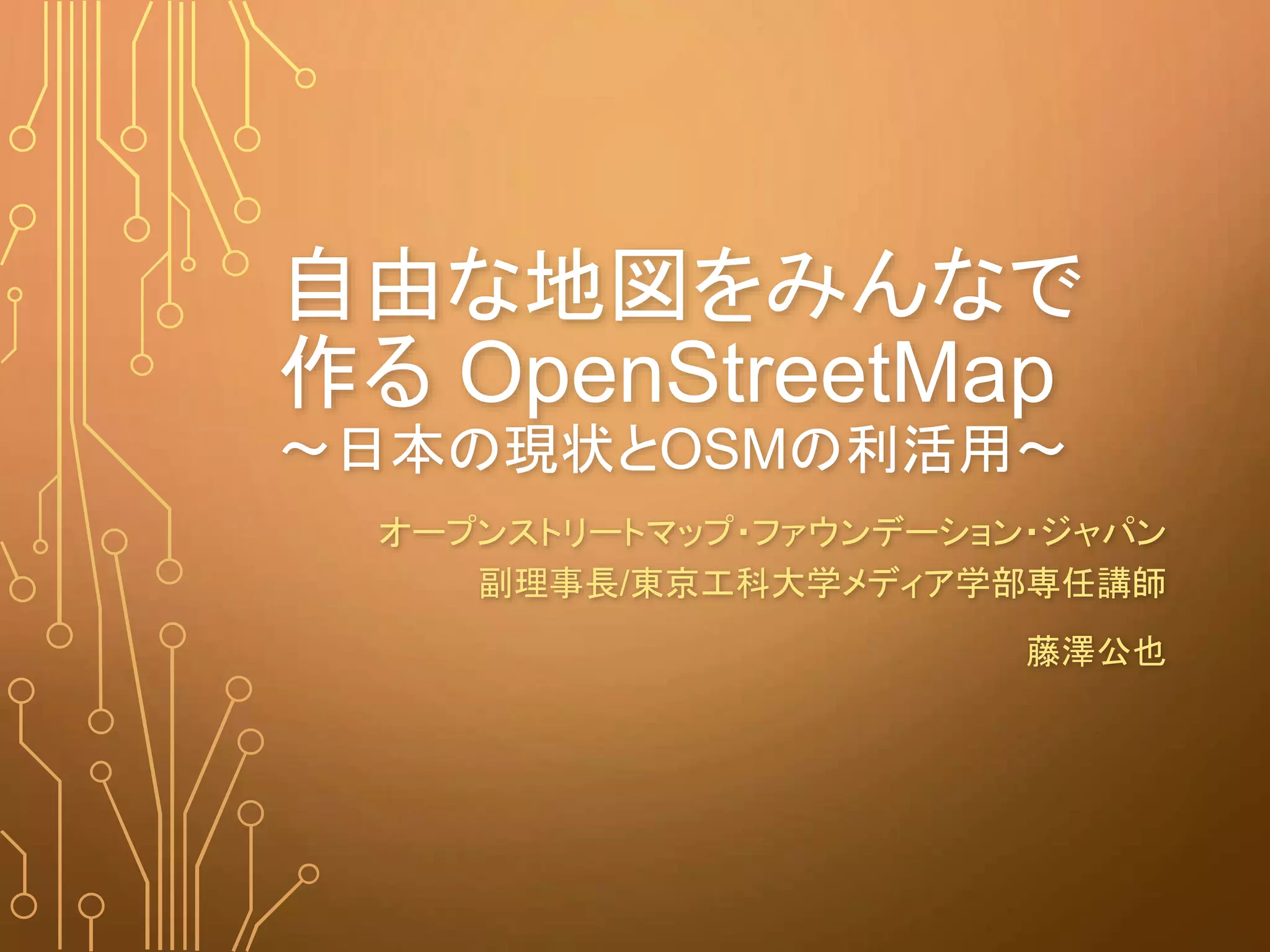 OpenStreetMap(OSM)は誰もが編集可能な地図の共同作成プロジェクトです。その特性から地図のWikipediaと呼ばれることもあります。ここではOSMの概要を紹介しつつ日本でのOSMの現状と利活用の動向について紹介します。