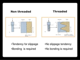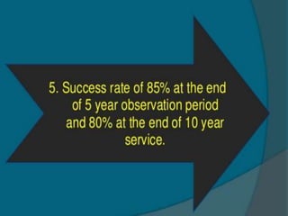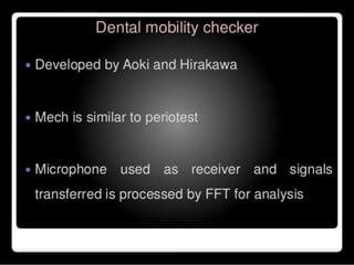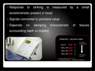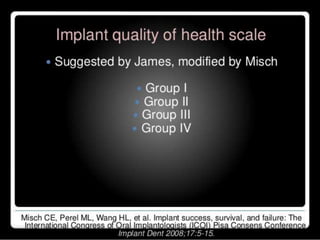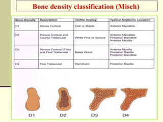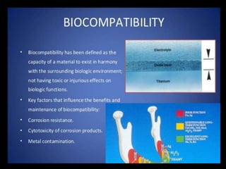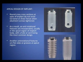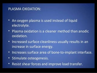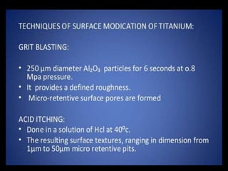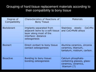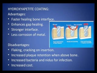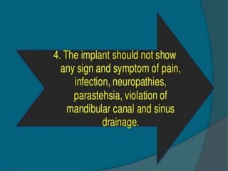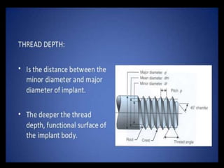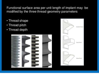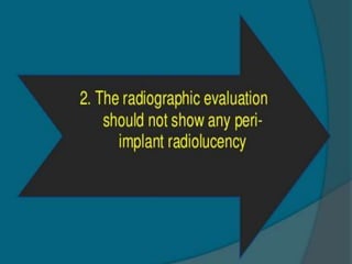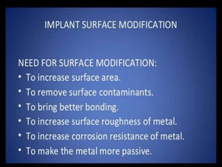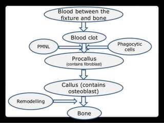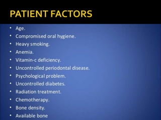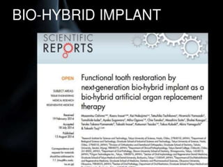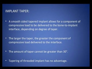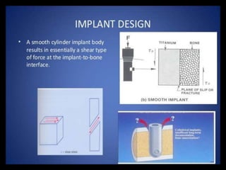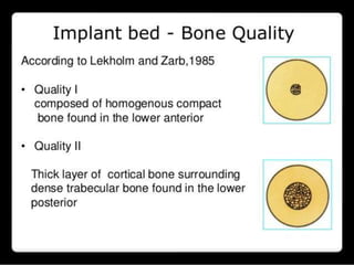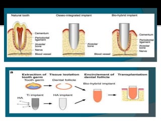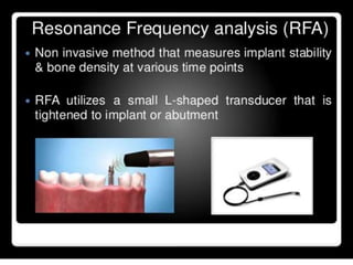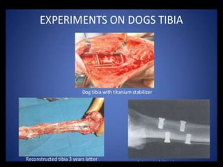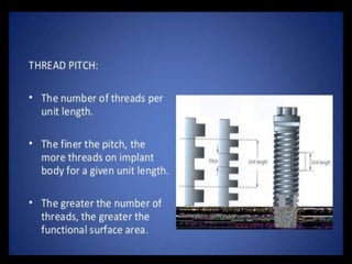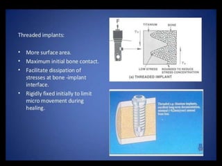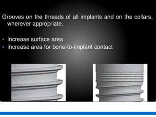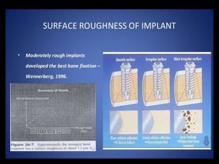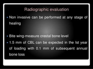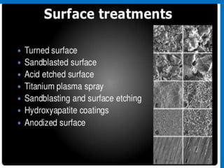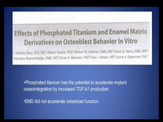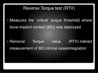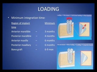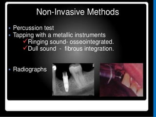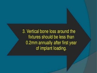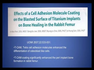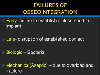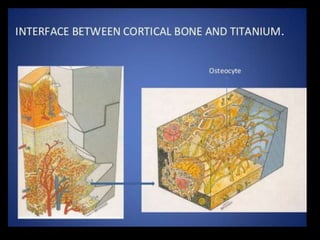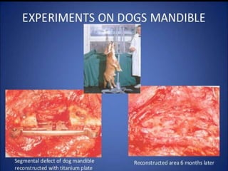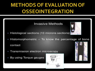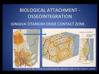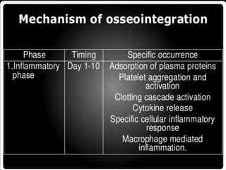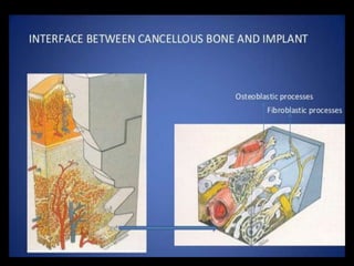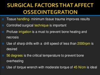 This document discusses osseointegration, which refers to the direct structural and functional connection between bone and the surface of a load-bearing dental implant without intervening soft tissue. It traces the history and development of osseointegration from early experiments in the 1950s to its current understanding. The key aspects covered include definitions of osseointegration, the biological process of bone formation around implants over time, factors that influence osseointegration success, and future directions for improving integration.