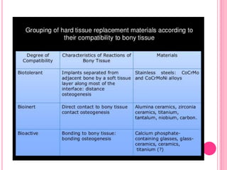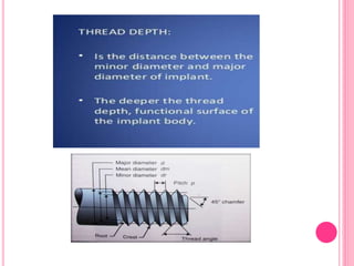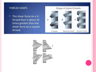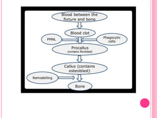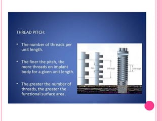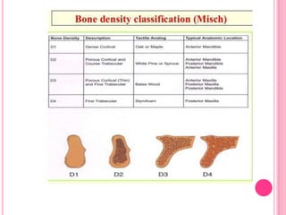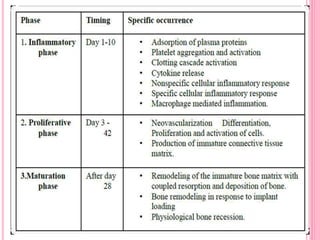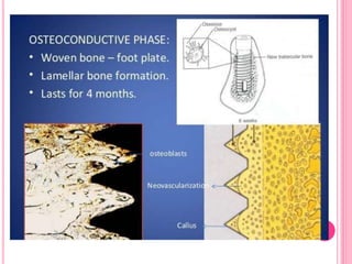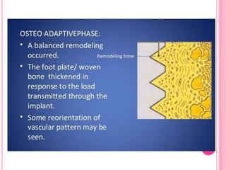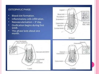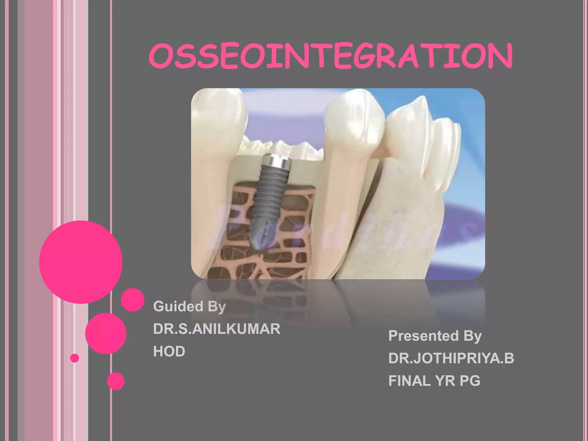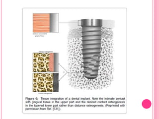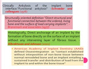 This document discusses osseointegration, which is the direct structural and functional connection between living bone and the surface of a load-carrying dental implant without intervening connective tissue. It covers the history, definitions, theories, mechanisms, and factors affecting osseointegration. The key points are that osseointegration was discovered by Branemark in the 1950s and involves new bone formation directly on implant surfaces through osteoconduction and remodeling over time to achieve a stable implant-bone interface. Factors like implant design, surface, material biocompatibility, and surgical technique influence the degree of osseointegration.