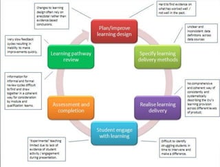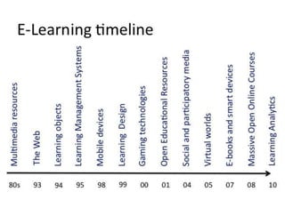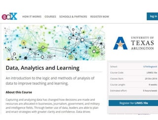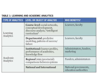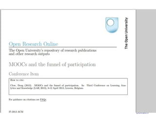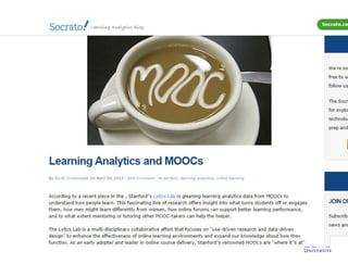 This document discusses MOOCs and learning analytics. It provides an overview of MOOCs, describing their massive, open, online nature. It also discusses the hype cycle of MOOCs and how we are currently in the deployment period. The document then covers learning analytics, how it can be used by educators, learners and organizations to monitor learning, identify patterns, and improve teaching. It notes some challenges in developing learning analytics and the importance of infrastructure to support it. Finally, it discusses some ethical issues that may arise from learning analytics.