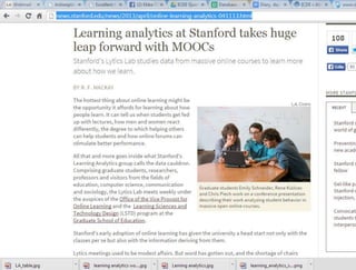 1) MOOCs have experienced a hype cycle but are now moving into a deployment period, bringing together innovations in pedagogy. Learning analytics also aims to advance personalized education through analyzing student data.
