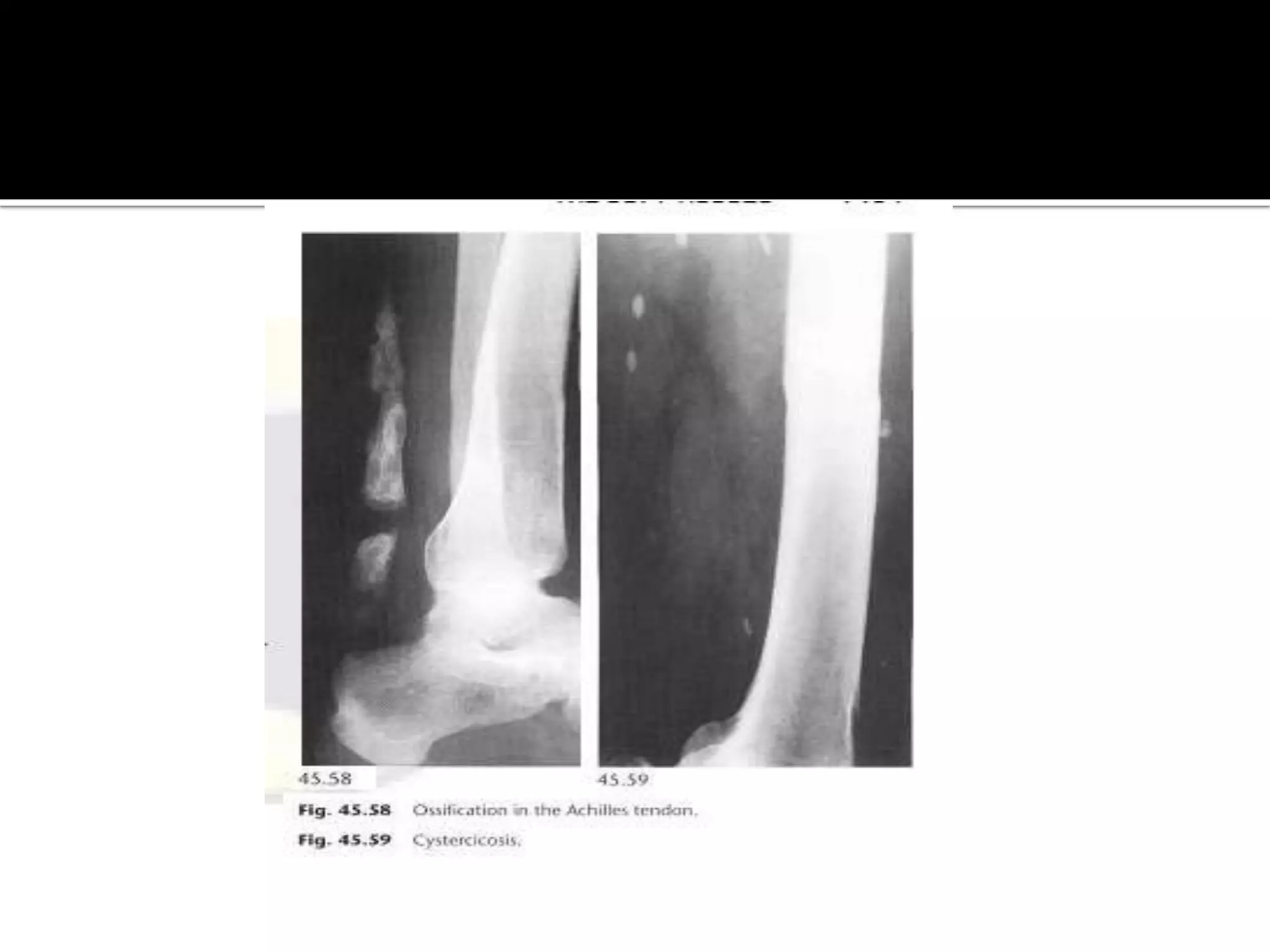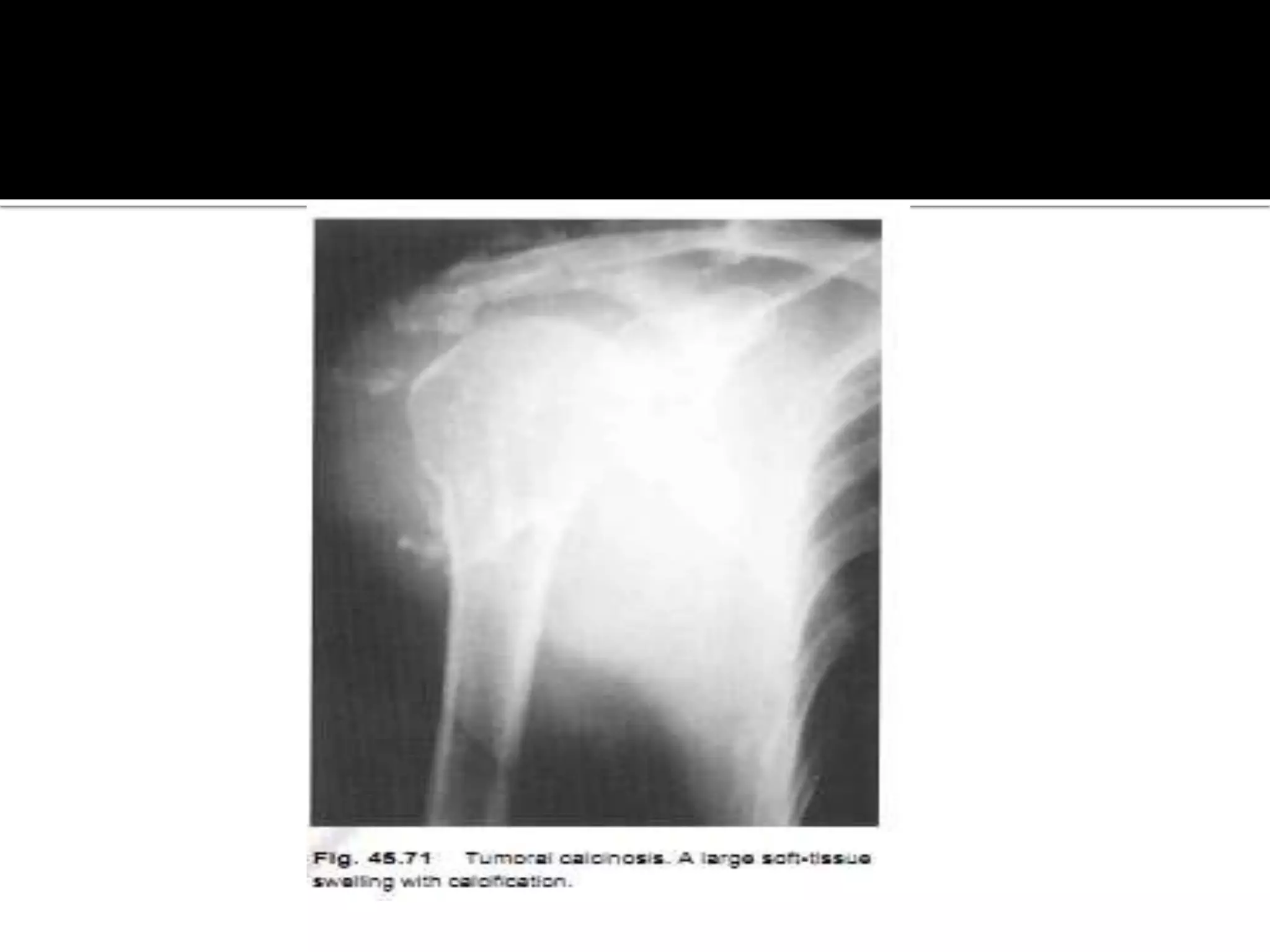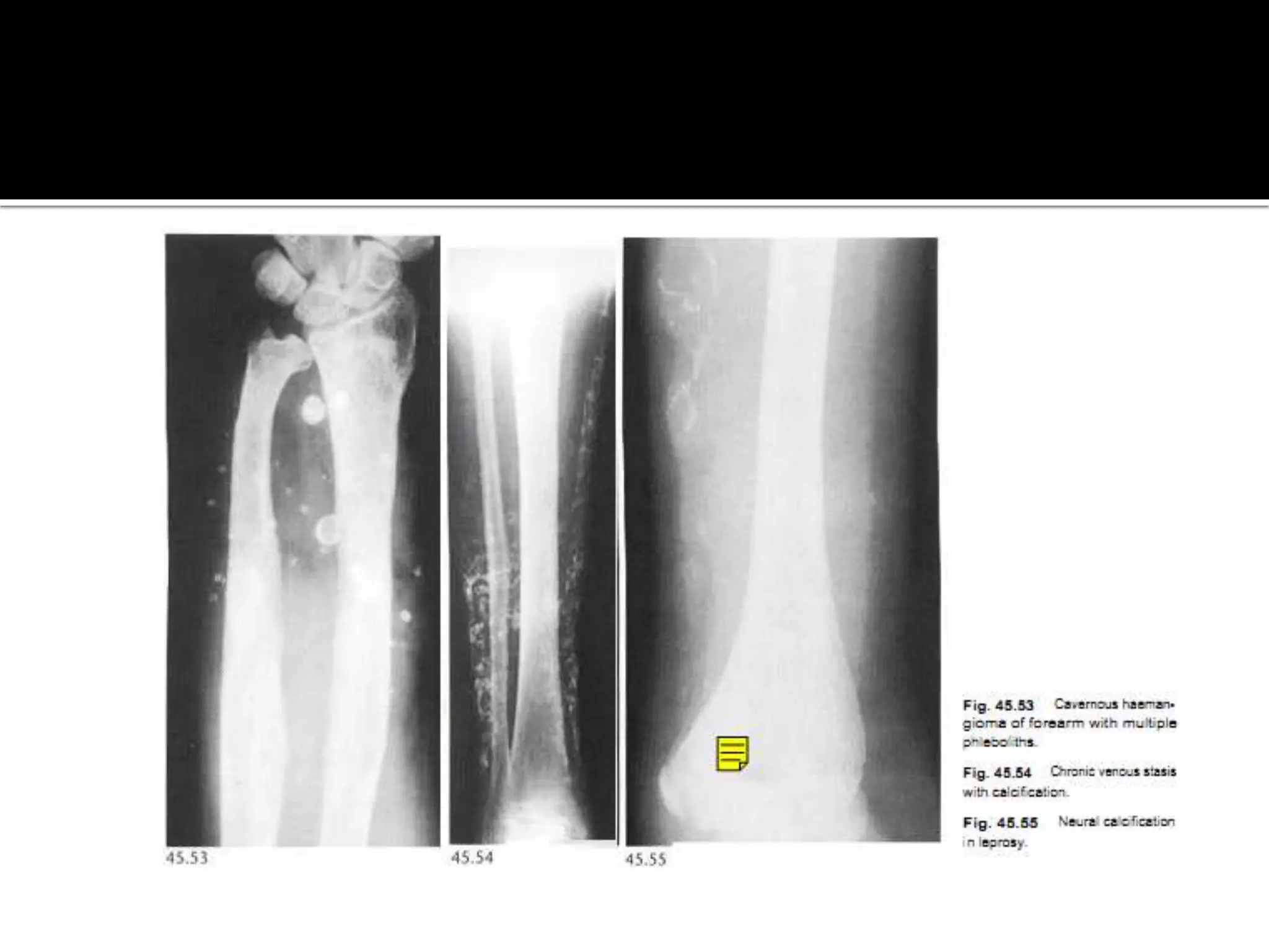 This document describes different types of calcification that can occur in soft tissues and arteries. It discusses metastatic calcification caused by abnormal calcium metabolism, dystrophic calcification related to tissue damage, and calcinosis which occurs with normal calcium metabolism. Specific types of soft tissue calcification are described associated with parasites, hematomas, necrosis, metabolic disorders, and various conditions like dermatomyositis. Calcification patterns in arteries, veins, tendons and various structures are also outlined. Different types of ossification including myositis ossificans, post-traumatic myositis ossificans, and paraplegic myositis ossificans are summarized.