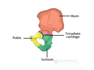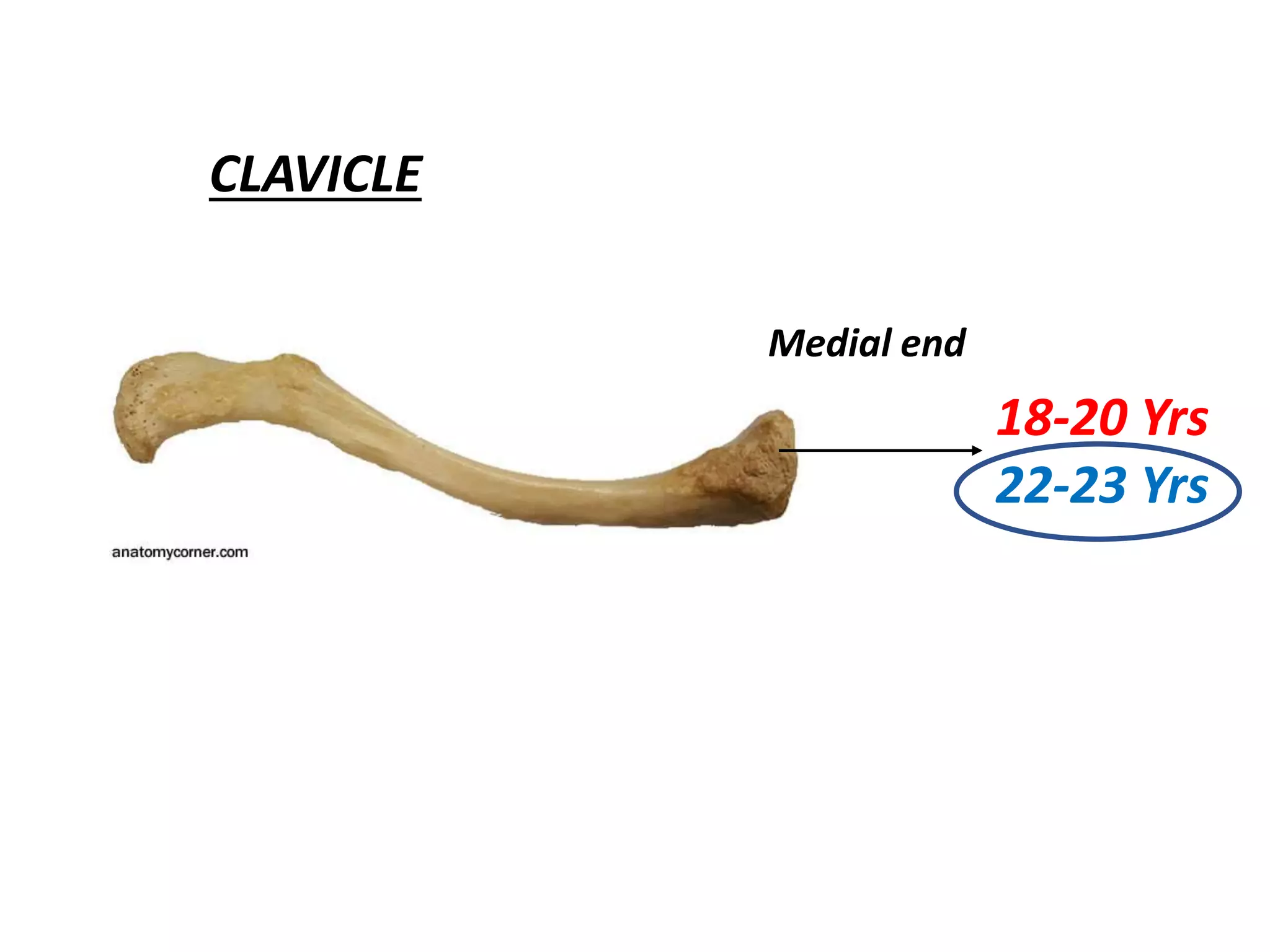 This document lists ages for the ossification and fusion of various bones in the human skeletal system. Key bones mentioned include: - Clavicle: Ossification begins at the medial end between 18-20 years and the lateral end between 22-23 years. - Scapula: Ossification of the acromion and coracoid process begins around 14 years of age. - Pelvis: The triradiate cartilage begins to ossify between 4-5 months in utero and fuses between 6-7 months. - Femur: Ossification begins in the head around 1 year of age and the distal end around 9 months in utero. -